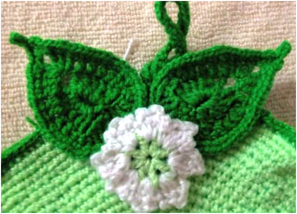 We made a flower with some leaves, in a web page I got a pattern to make a leaf. We placed the flower and the leaves on the front of the pot holder with a wool needle.
