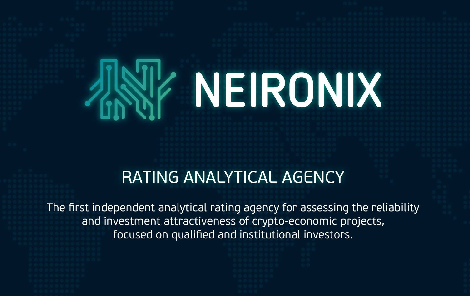 Neironix is the first independent international rating agency to evaluate investment risk in the blockchain economy, where ratings are assigned to automation projects based on calculation results, neural networks and multidimensional numerical analysis. large amount of data. This platform is designed for the subsequent risk analysis and management of projects that invest in high-uncertainty projects. Neironix's mission is to become a global provider of financial information and analytics for the money-market, necessary to make a weighted investment decision and develop a long-term market strategy.