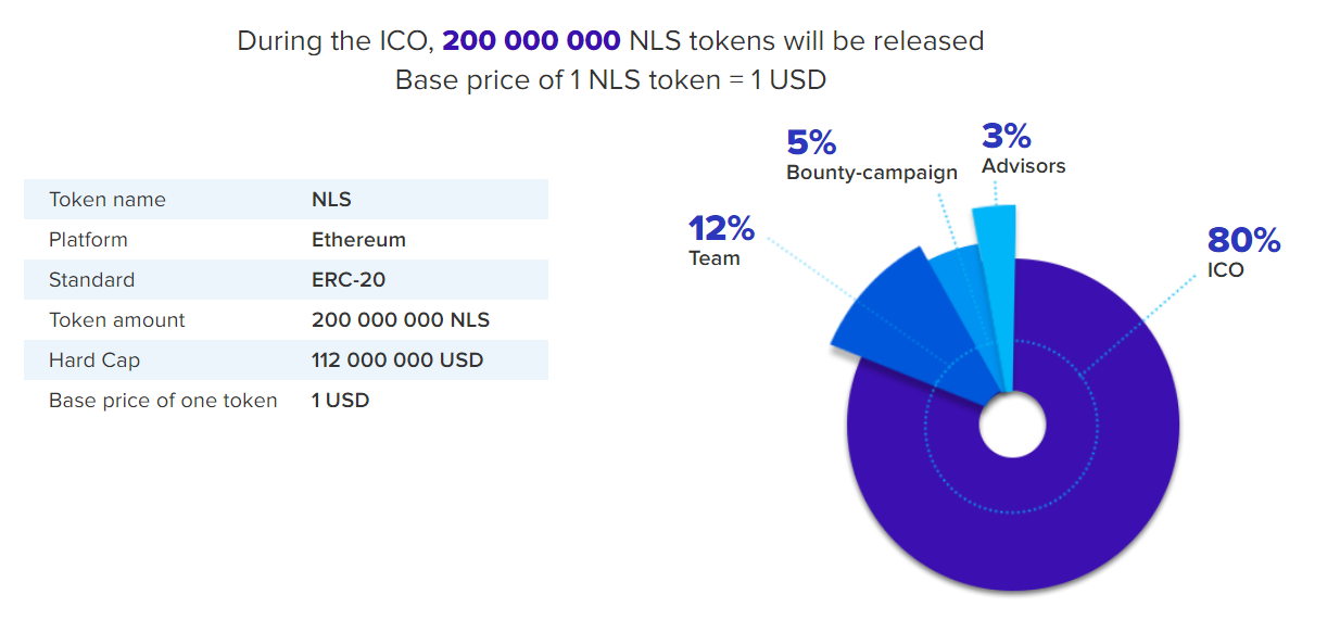 Для расчетов на проекте используются токены NLS, реализованные на базе Ethereum по стандарту ERC-20. Использование токенов Neluns позволяет проводить операции по наименьшей стоимости. До 5 октября включительно на проекте проходит краудсейл, в рамках которого можно приобрести один токен за 1 доллар. Всего на продажу направлено 200 млн токенов, что составляет 80% от общего выпуска. Первые два этапа ICO прошли успешно. Софткап основного этапа составляет 10 млн долларов, хардкап – 112 млн долларов.