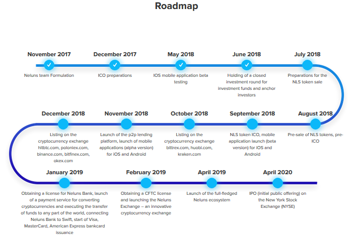 On january 2019 Obtaining a license for Neluns Bank, launch of a payment service for converting cryptocurrencies and executing the transfer of funds to any part of the world, connecting Neluns Bank to Swift, start of Visa, MasterCard, American Express bankcard issuance, this is interesting for a long-term project.
