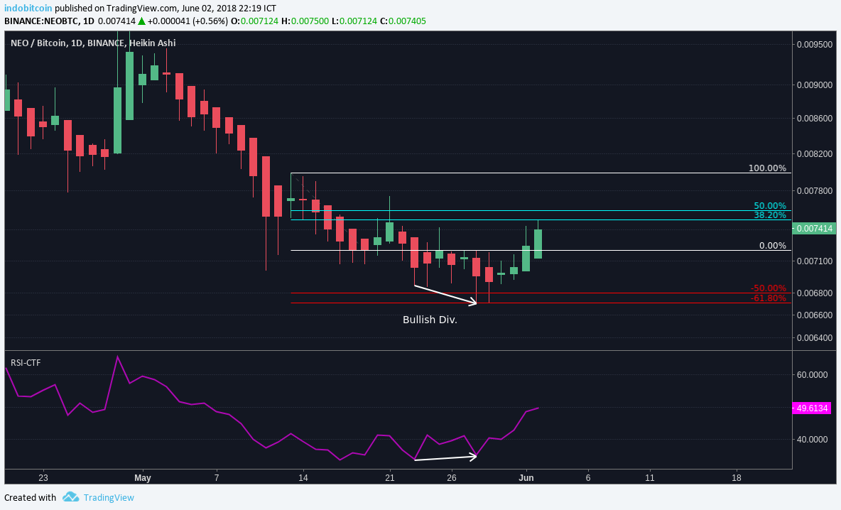 Daily chart is showing NEO is gaining upside momentum after low was formed at 6700 satoshi also formed completion of Bullish Divergence. RSI is still in the middle level so there are chances of more gain in near term.