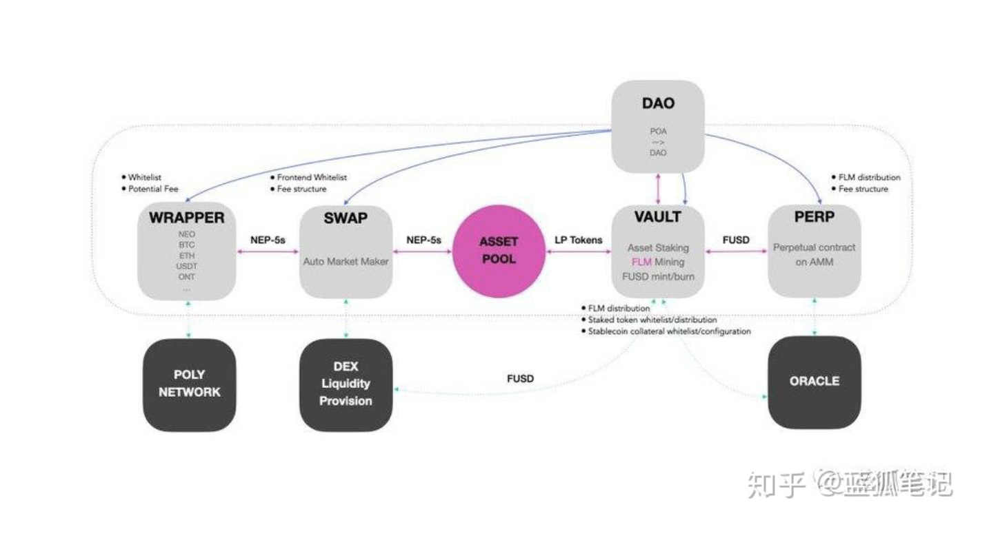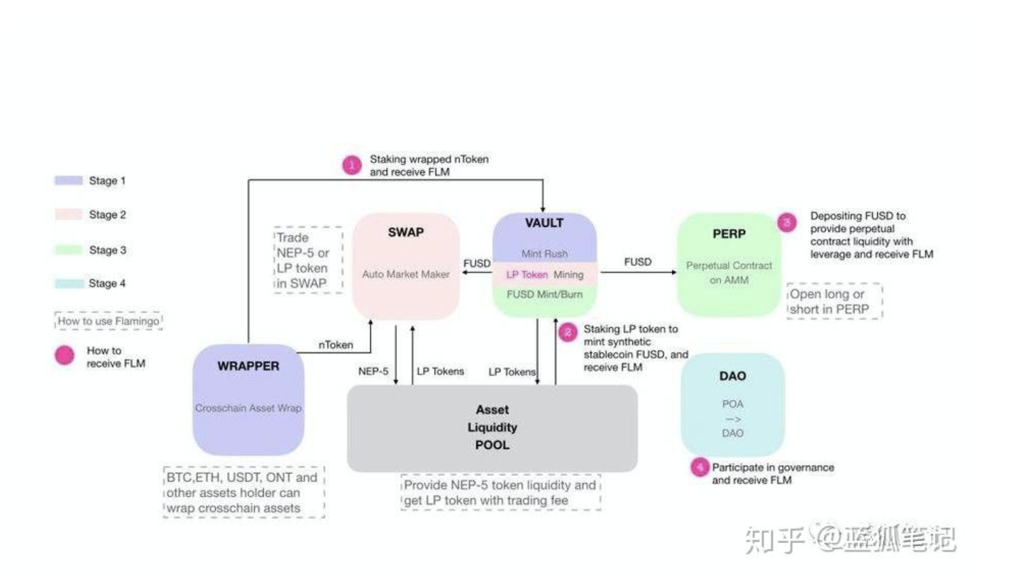 In terms of specific components, Neo's Flamingo's DeFi exploration includes WRAPPER, SWAP, VAULT, PERP, and DAO. Among them, WRAPPER is a multi-asset cross-chain gateway, SWAP is an on-chain liquidity trading market, VAULT is a protocol for generating stable coins and platform tokens, PERP is an on-chain perpetual contract trading platform based on the AMM model, and DAO gives Flamingo’s community Governance. From Neo's plan, cross-chain asset transfer, pledged asset mining, DEX trading, stable coin generation, and perpetual contract DEX will be gradually launched.