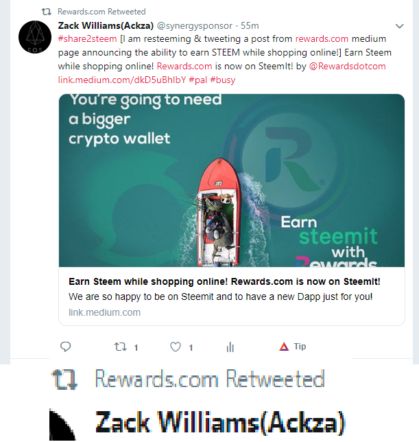 My share2steem reposting of the Rewards.com Medium Post announcing teh steem partnership was RETWEETED by Rewards.com official twitter! Now what was just steem being added with many other altcoins is now about steem!