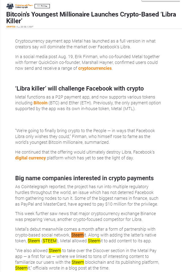 Steem/steemit mentioned heavily at end of this Article about "Bitcoin's Youngest Millionaire" and his new investment in METAL pay + Steem is showing up in the news now after coming back online