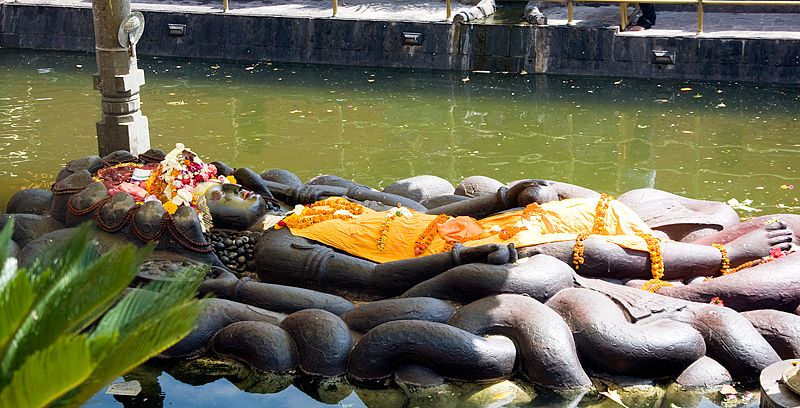 Located here is the deity of lord Vishnu, Vishnu(Narayan), lying on the Ananta sesa, in the cosmic ocean.The deity is over 1,000 years old.Lord Vishnu is about 5m(17ft) long and is lying on the 13m(43ft) long tank as if floating,with his leg crossed.