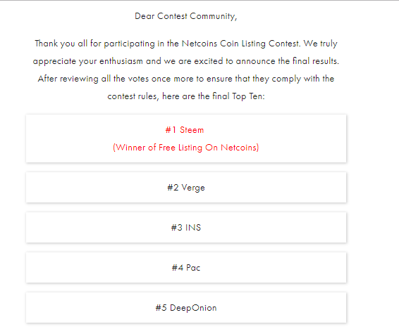 Congratulations steemains. We win the Netcoins Free Listing Contest!