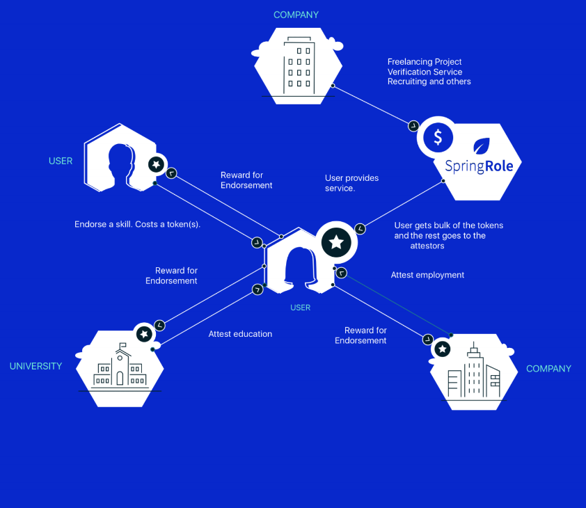 Springrole is a blockchain based platform that is seeking to resolve what it sees as being an issue with dealing with staff within the realm of running a company. They state that the way in which people are hired is flawed leading to the best candidates often missing out and someone who is less well qualified being able to effectively sneak into the position. (https://steemit.com/crypto/@dan90/springrole-ico-review). SpringRole is the platform where people can view, share and get attestations on their professional profile, thereby creating a verified resume that they can share and use. A user’s educational qualifications and work experience are verified by the organizations themselves and written directly to the blockchain.To assess a user’s skill set, SpringRole has a system of weighted endorsements that let users objectively look at people’s profiles and assess their skill level.