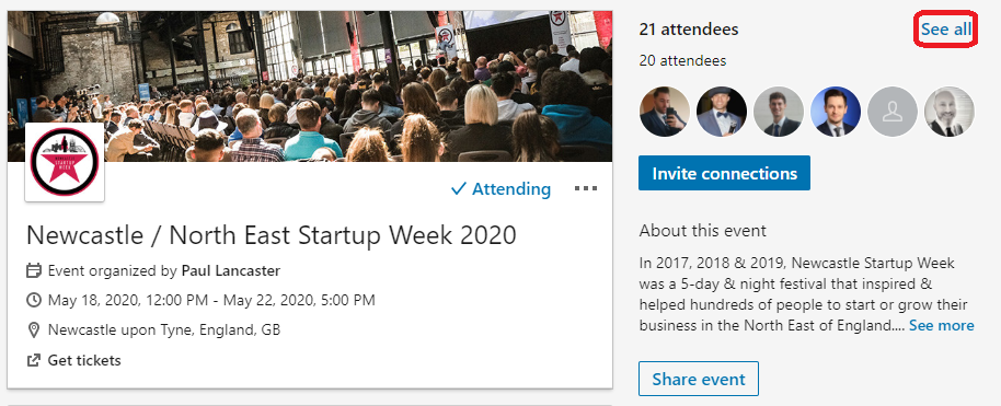 Once you are marked as attendees click on the “See all” button to get the list of attendees: