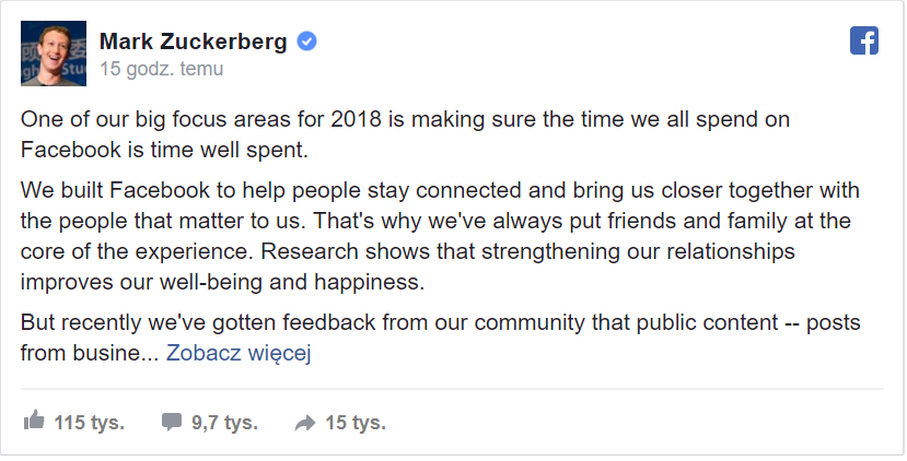 After the changes that Mark Zuckerberg announced, the majority of what we will see on its timeline or feed will be materials published by our friends. The quantity and importance of materials thrown by companies will fall. This is to encourage people to talk and interact with loved ones instead of absorbing more articles or watching commercials.