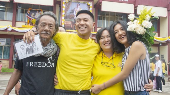 Mr Jatupat left jail right off the bat Friday morning and was brought together with his family and companions who were holding up outside.