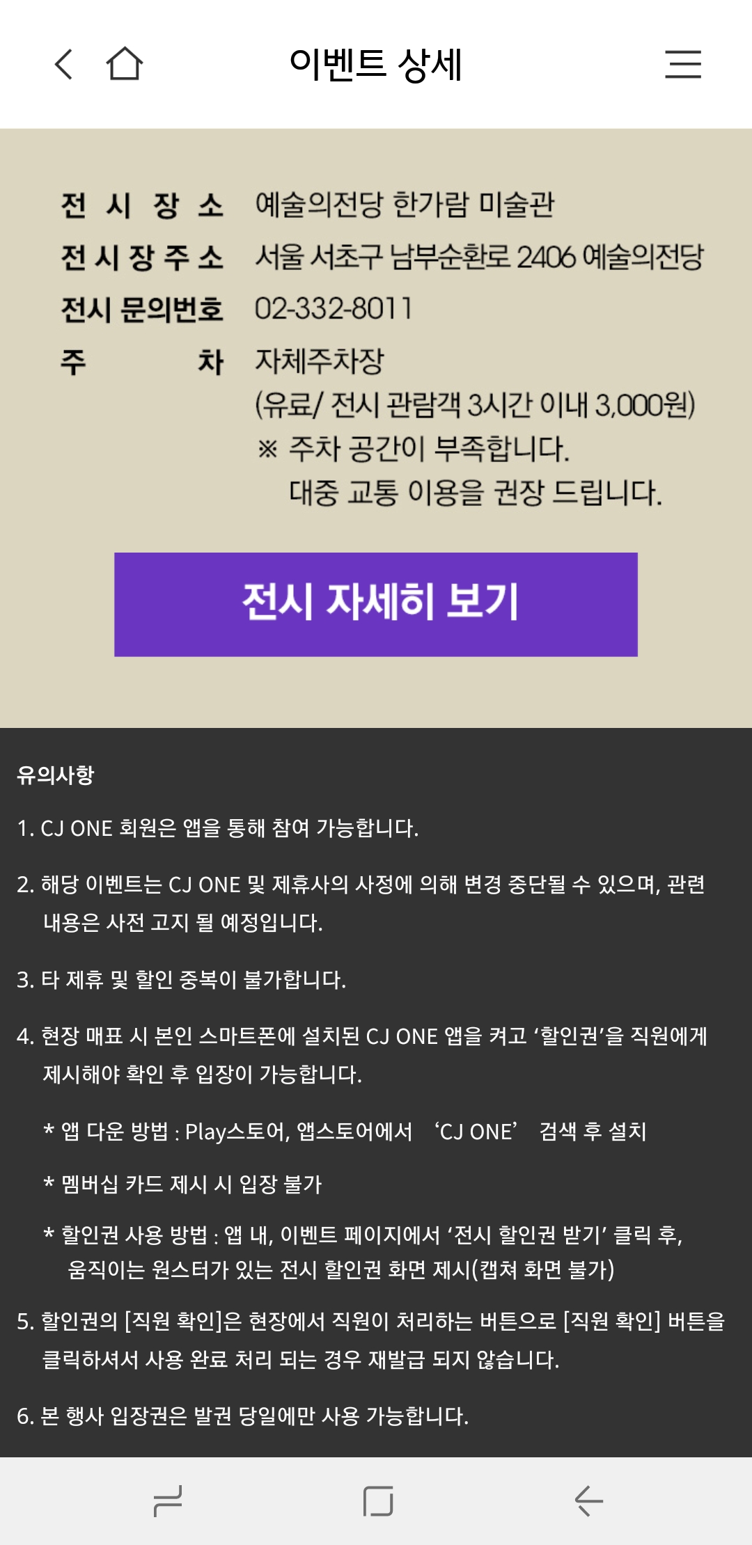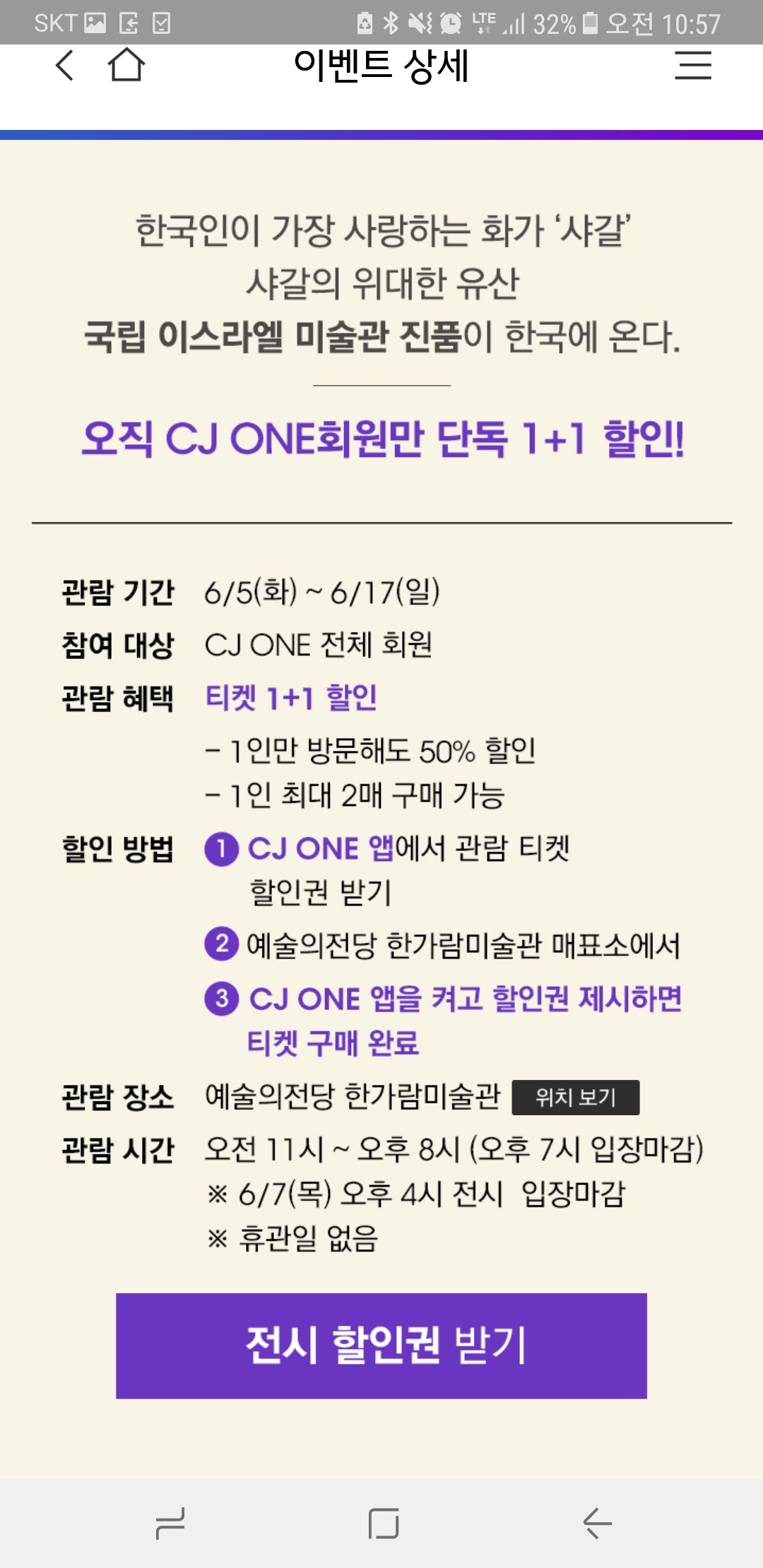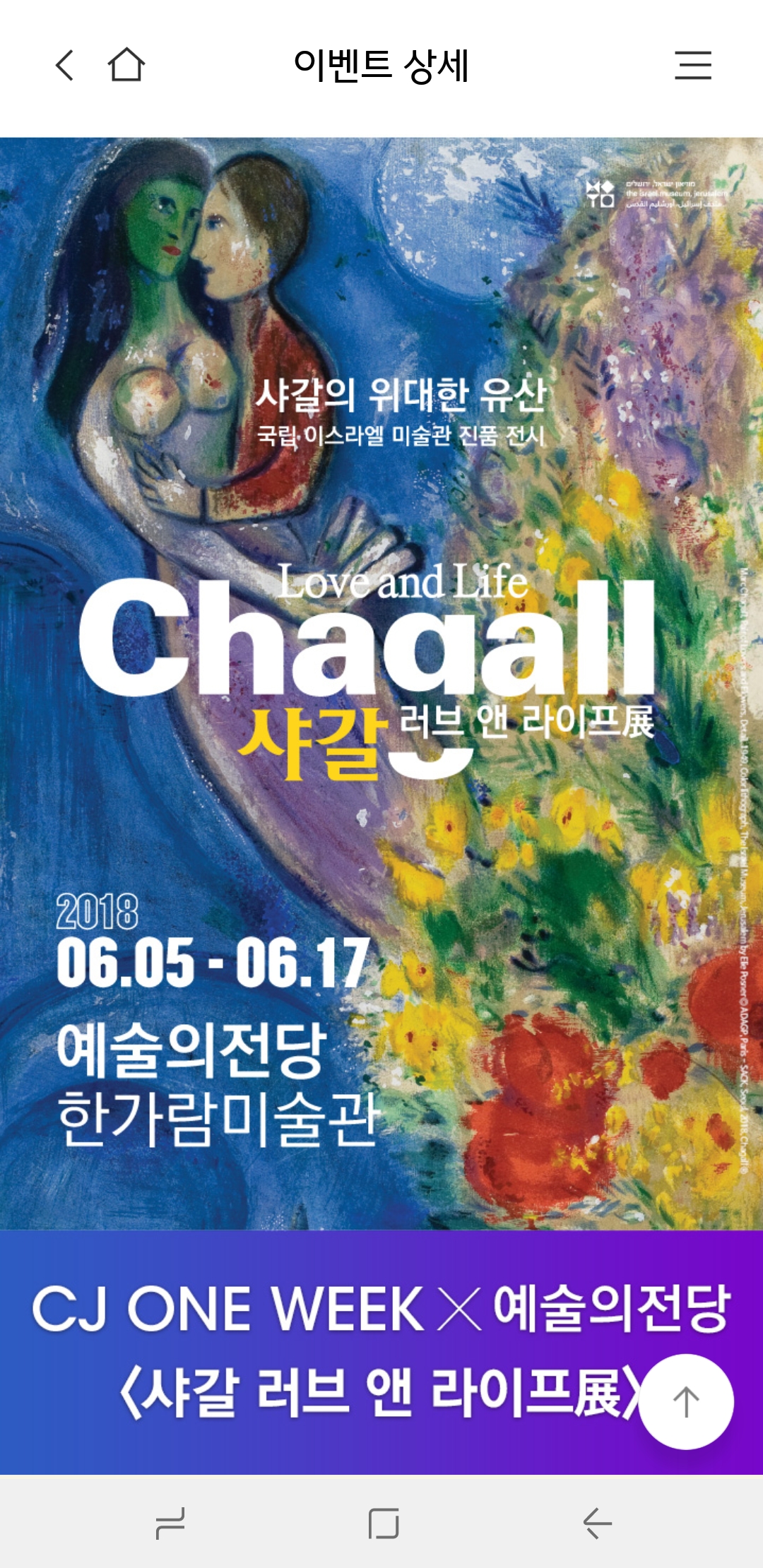 샤갈 러브 앤 라이프 예술의 전당 50%할인!minju85 (44)in #newbie • 8 years ago '샤갈 러브 앤 라이프' 전이 예술의 전당 한가람미술관 에서 전시되고 있는데요 국립 이스라엘 미술관 진품이 왔다고 합니다ㅎㅎ 한국인이 가장 사랑하는 화가 샤갈을 50%에 볼 수 있다니! 할인 끝나기 전에 가봐야하겠습니다. CJONE 할인이벤트는 6/17(일)까지인데 혼자 가기는 싫어서 요즘 소모임을 통해 새로 참석중인곳이 있는데 같이 가실분을 모집해봐야겠어요^^ 개발자이지만 감성도 키울겸 저렴하거나 무료 기회가 오면 찾아다니고 있습니다ㅎㅎ #chagall #cjone #loveandlife
