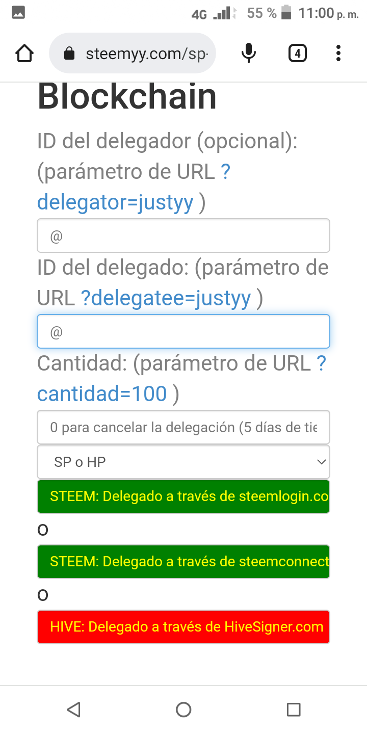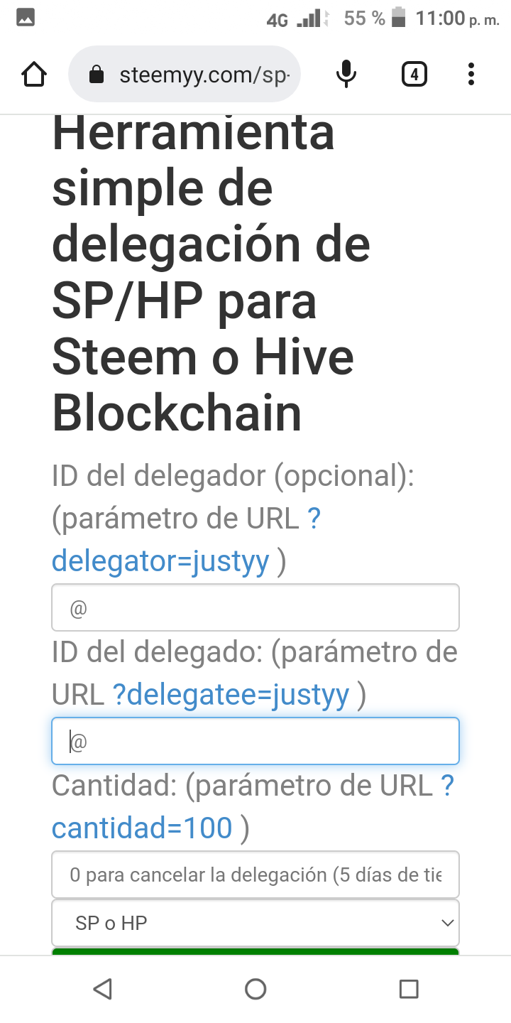 Accederás a ésta página, en donde debes ingresar el ID del delegador, el ID del delegado, la cantidad de SP a delegar y tú clave activa. Finalmente presionas el botón verde y listo 😁🫶🏽.