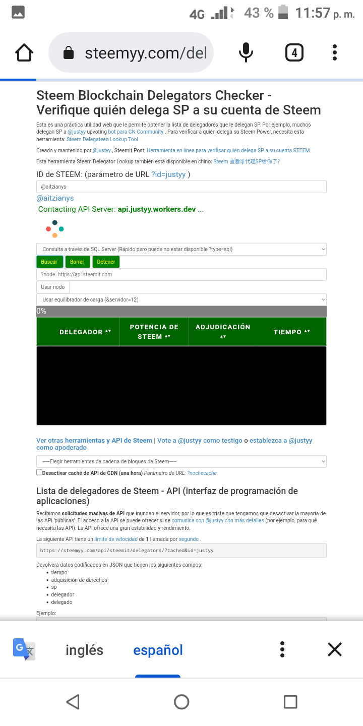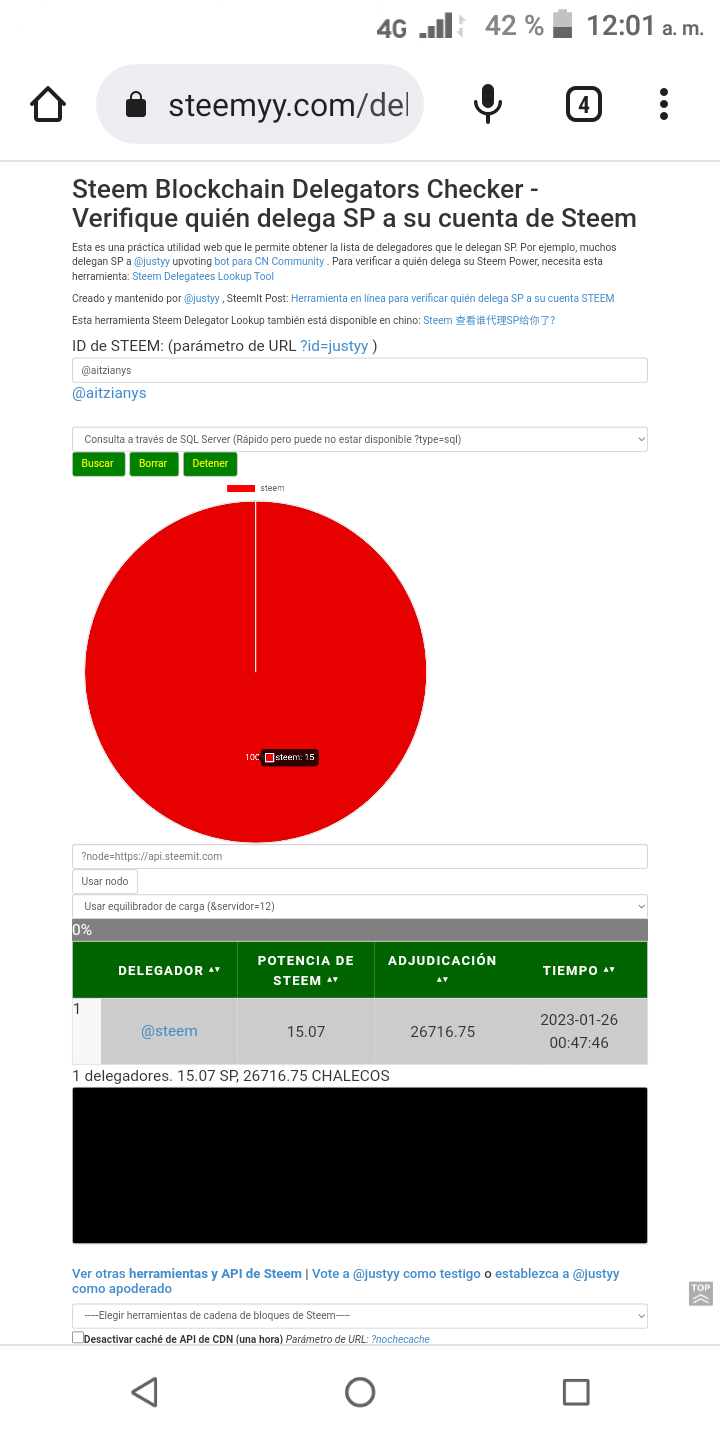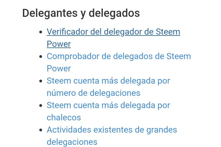 R. En la sección de herramientas bajas hasta "Delegantes y delegados", ahí seleccionamos en "Verificador del delegador de Steem Power".