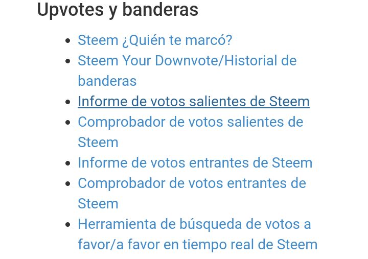 En la misma barra de herramientas nos vamos a la parte donde nos dice "Upvotes y banderas" y ahí seleccionamos "Informe de votos salientes 📤 de Steem".