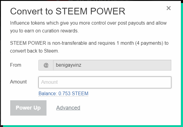 • Similar to the process of transferring STEEM tokens, initiating a power-up requires logging in using the Private Active Key. Within the Balance tab, the action begins by clicking the dropdown arrow adjacent to the STEEM balance. From there, selecting 'Power Up' prompts a pop-up window, enabling the user to specify the desired amount for conversion into STEEM POWER. This strategic maneuver bolsters one's influence within the Steemit ecosystem.