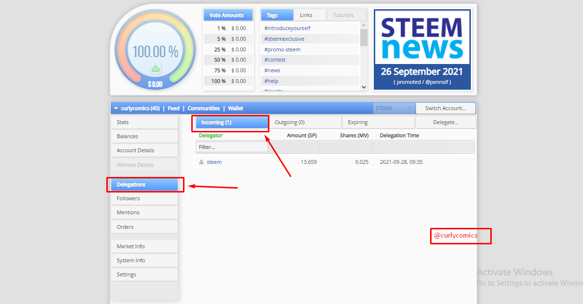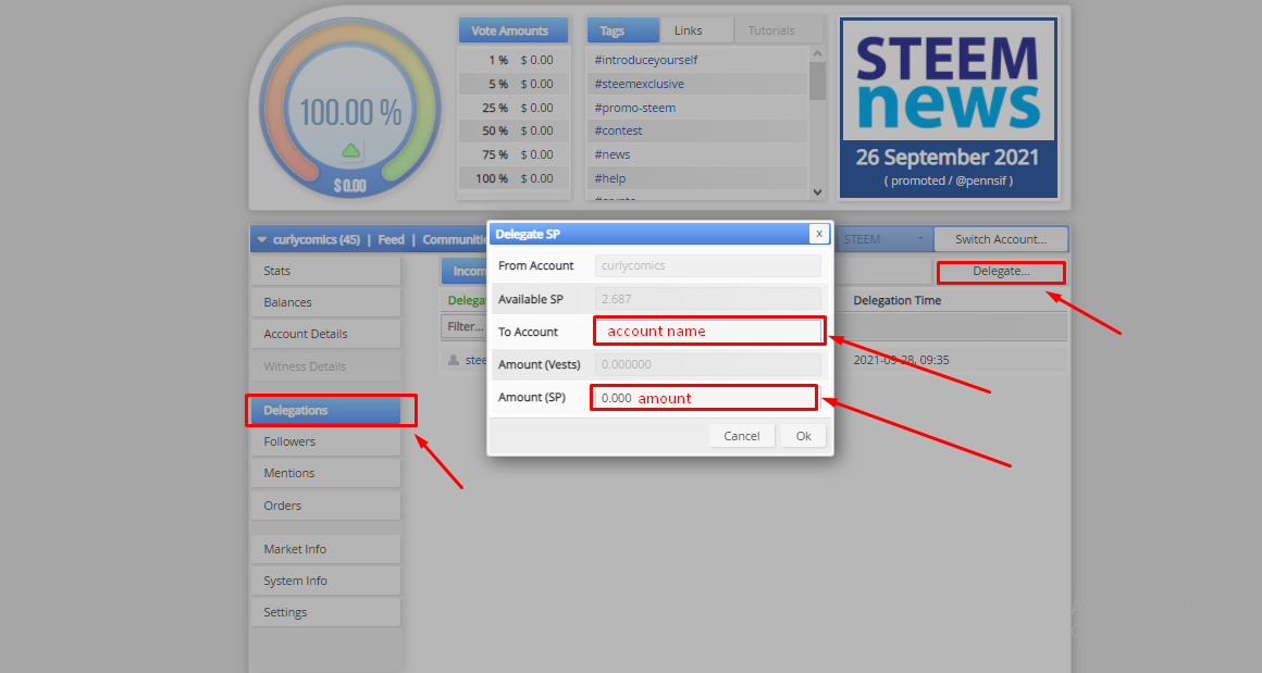 Delegations Are Those Used To Share Or Lend Our Steem "SP" Power With Another User On The Platform, It Is Widely Used To Support New Users With Low Power. There Are Two Types Of Delegations, The Incoming Delegation, Which Is When We Receive "SP" From Other Users, And The Outgoing Delegation, Which Is When We Loan Our "SP" To Another User Or Account. To Carry Out This Process We Just Have To Go And Press (Delegations), Click Again On The Other Option That Will Be Called (Delegate), This Will Throw Us A Box Which We Only Have To Fill In With The Corresponding Data.