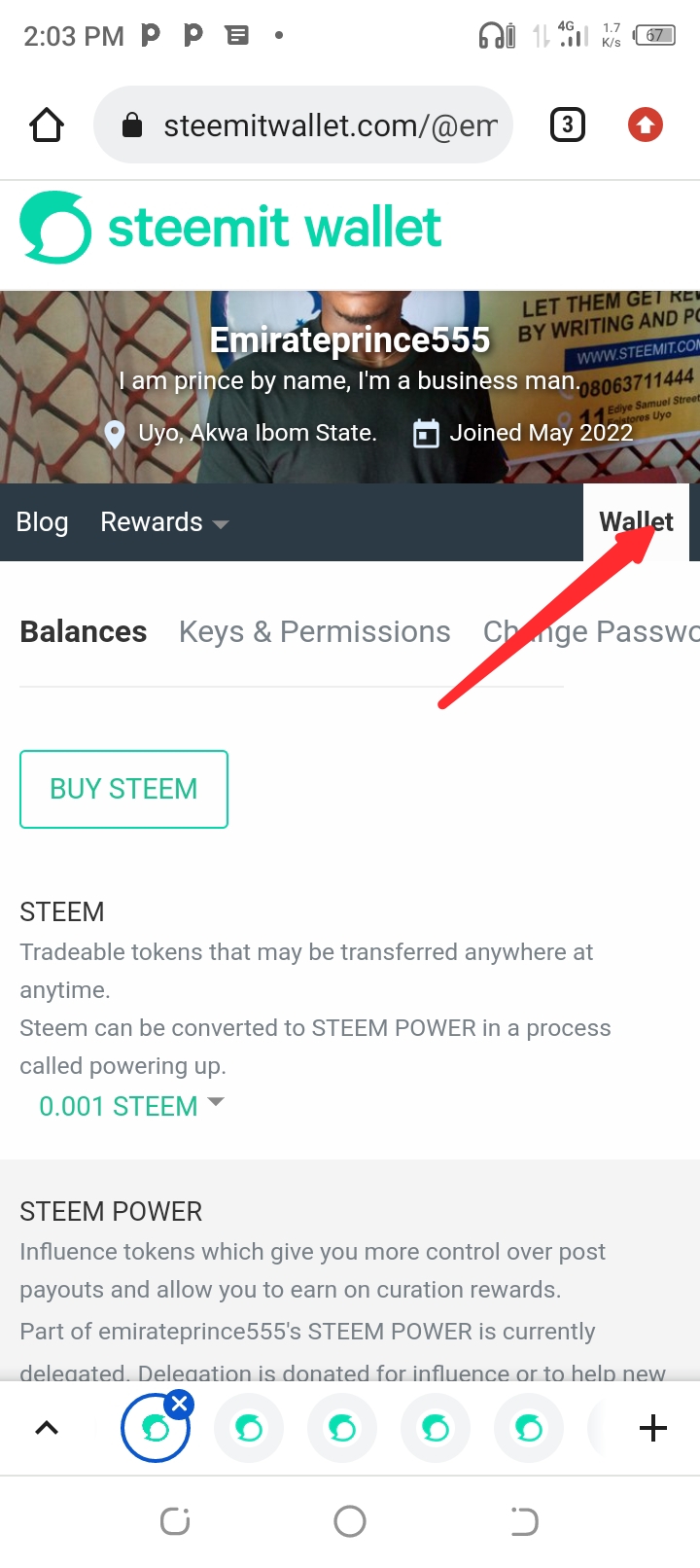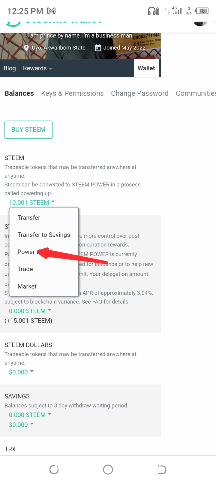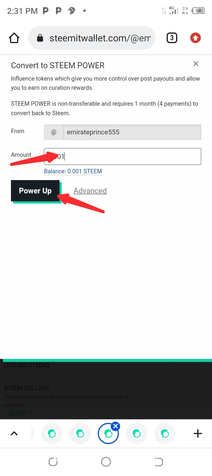 And then I go back to that arrow beside steem, click it and then click power up.