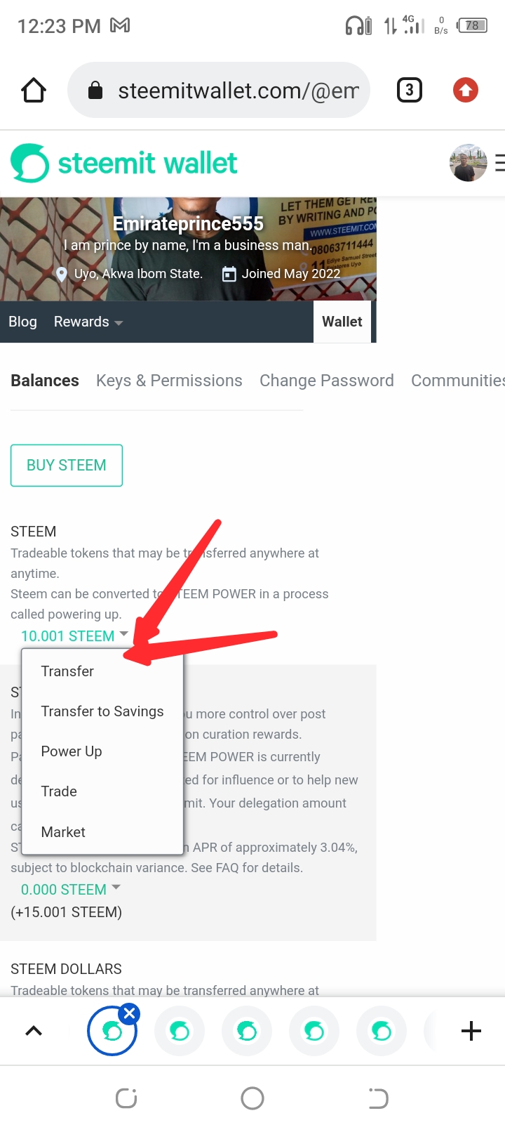 After that i will click the arrow beside steem and click transfer.