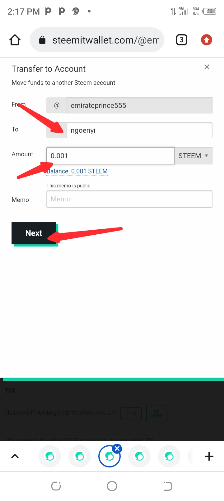 Finally I will type in the username of the one I am transferring to and the amount and click on next that's how easy it is to transfer steem token.