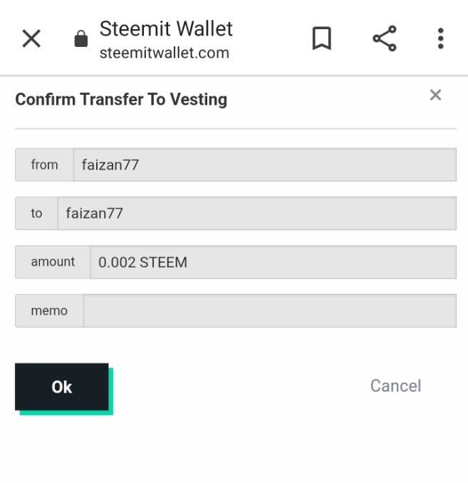 - Again a box appeared to confirm the transfer, I created memo and aftet confirmation I was able to power up the STEEM.