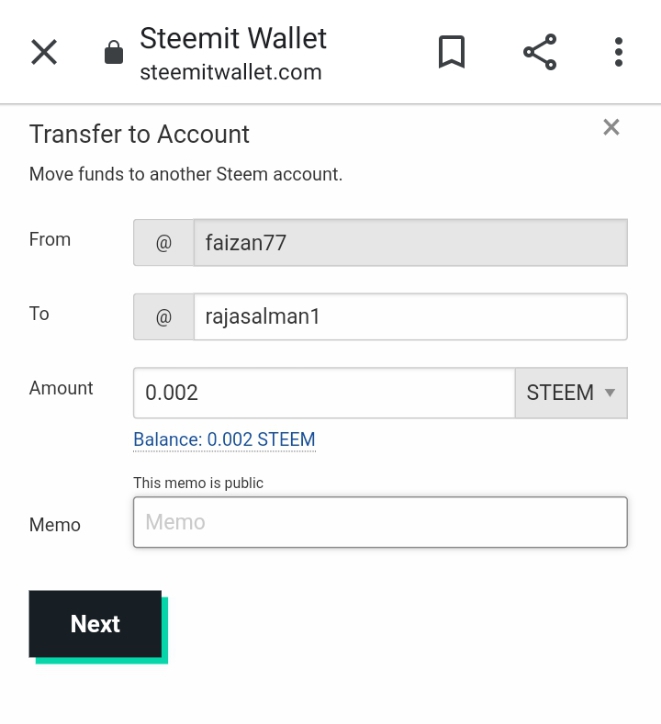 - Aftet clicking on transfer option, a "tranfer to account" box appeared in which, I mentioned the ID of that user whom I want to transfer the Steem token.