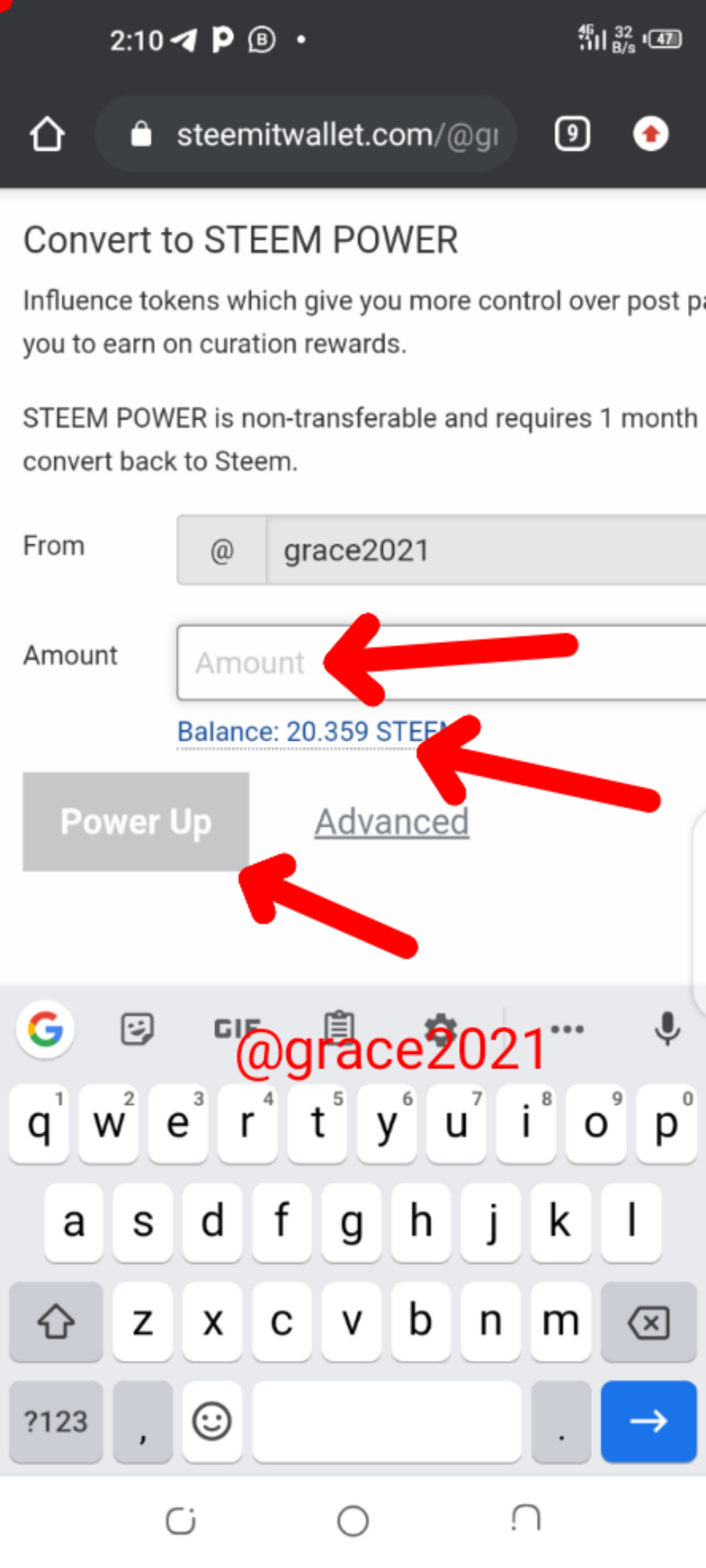 Specify the details like the amount of steem to power up as labeled above and click on POWER up