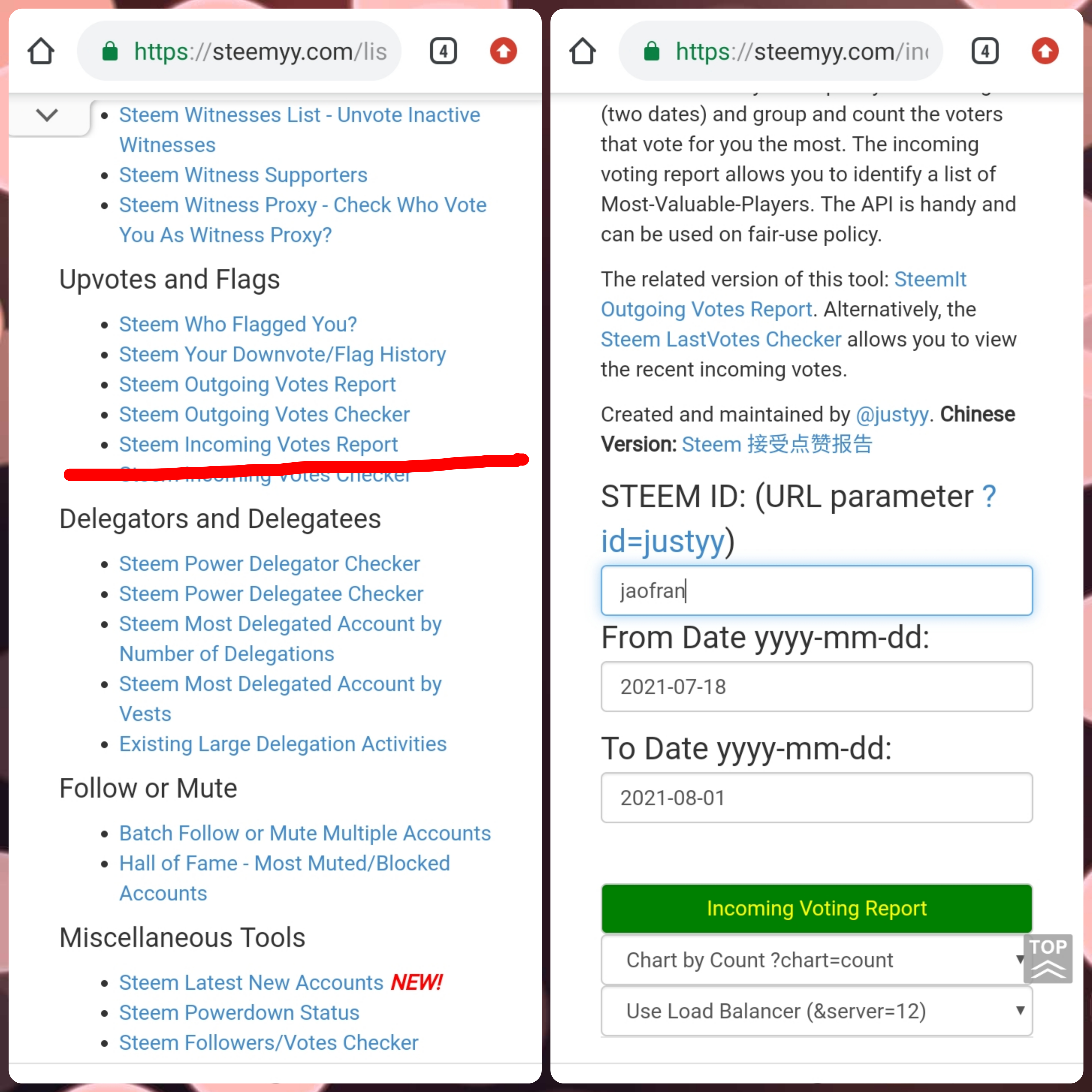 6.How do you check the incoming votes report for any specified period using "Steem Incoming Votes Report"?