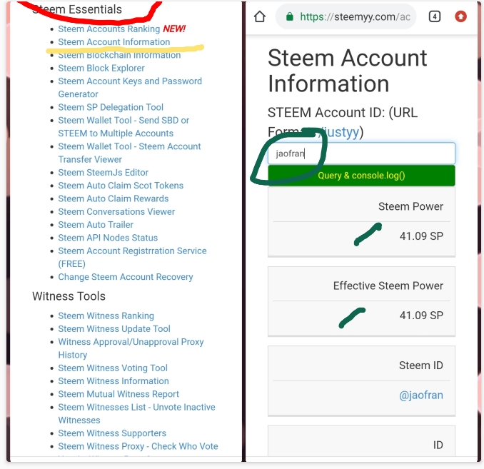 I have showed the Steem Tools features. Then you just need to click the STEEM ACCOUNT INFO to track your info. Just input your username. You can view my Effective Steem Power, 41.09 SP, my capable indluence power in my account.