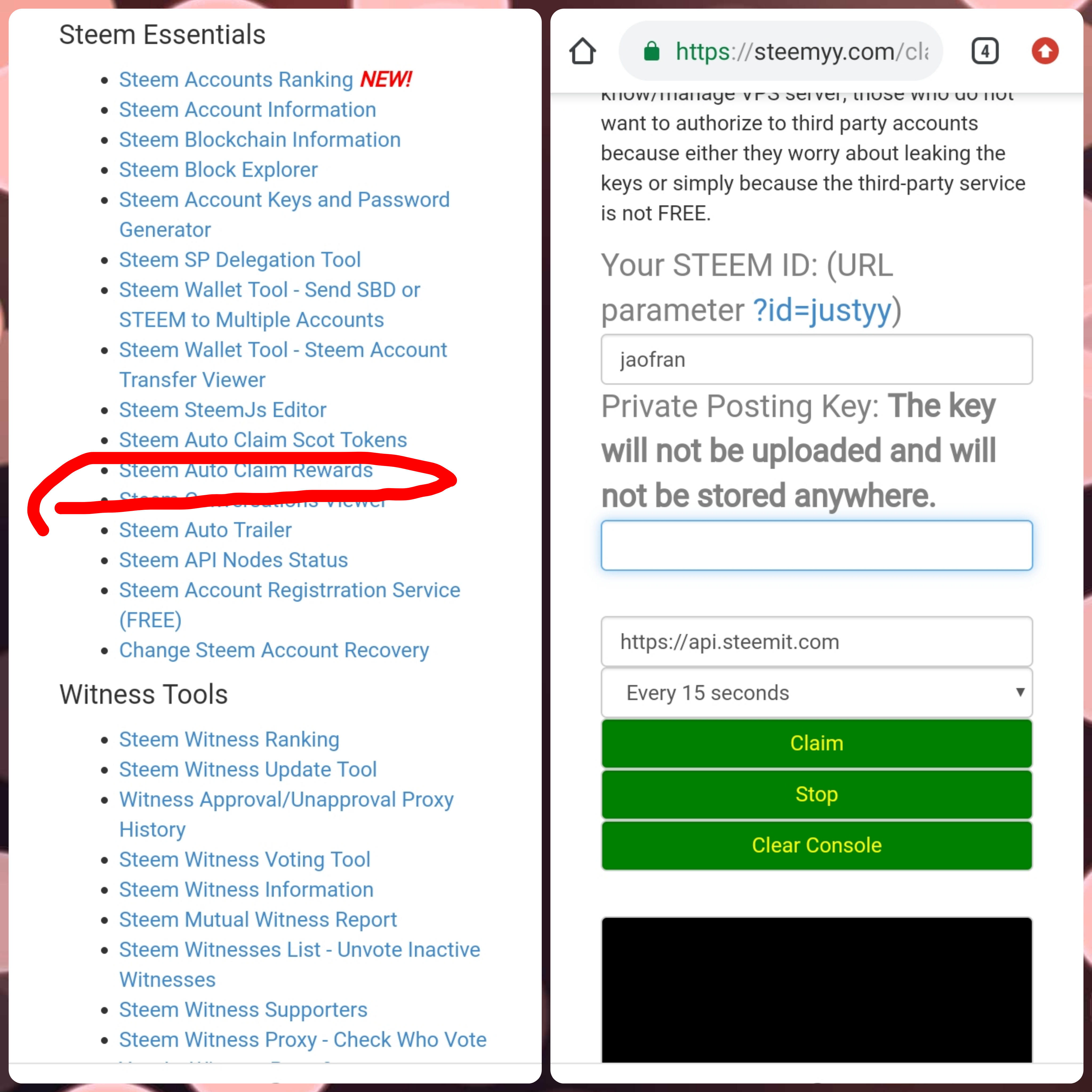 Then, enter your "Steem ID" and the needed "posting key". Also set the interval time you want it to auto claim. Lastly, click the "claim".