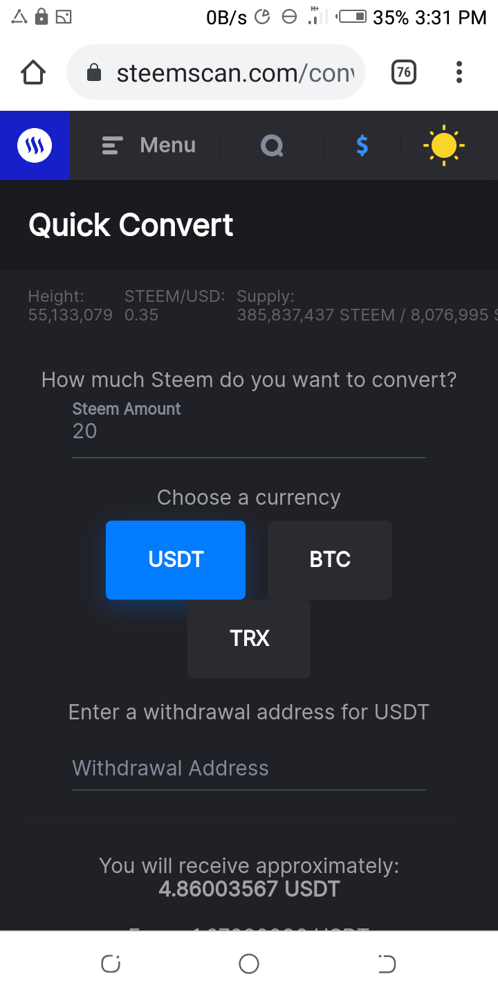 Steemscan is an exchange for converting steem to another cryptocurrency such as TRX, USDT and BTC
