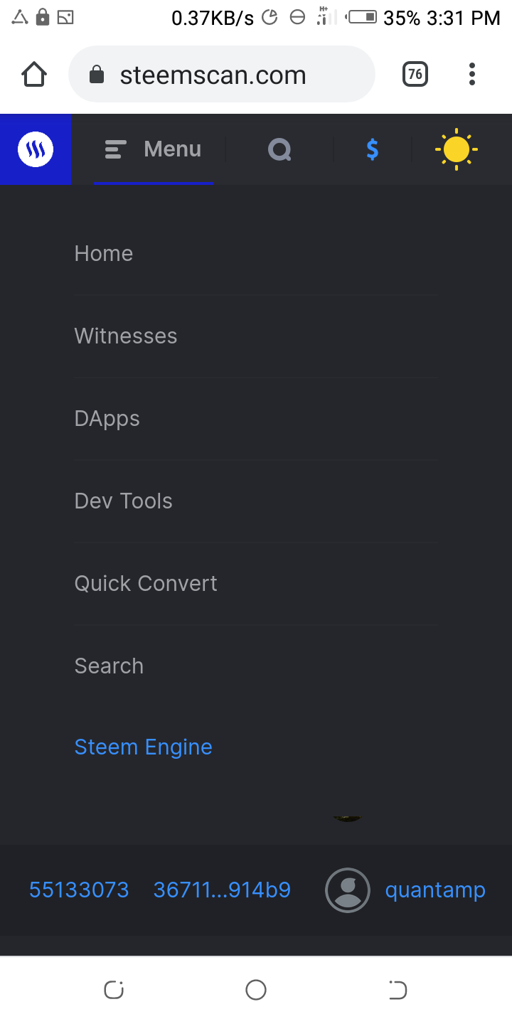 For You To get a view of everything in it, tap on the menu bar and a list will appear displaying the following features such as, Witness, DApps, Dev tools, Quick Convert, Search And steem Engine.