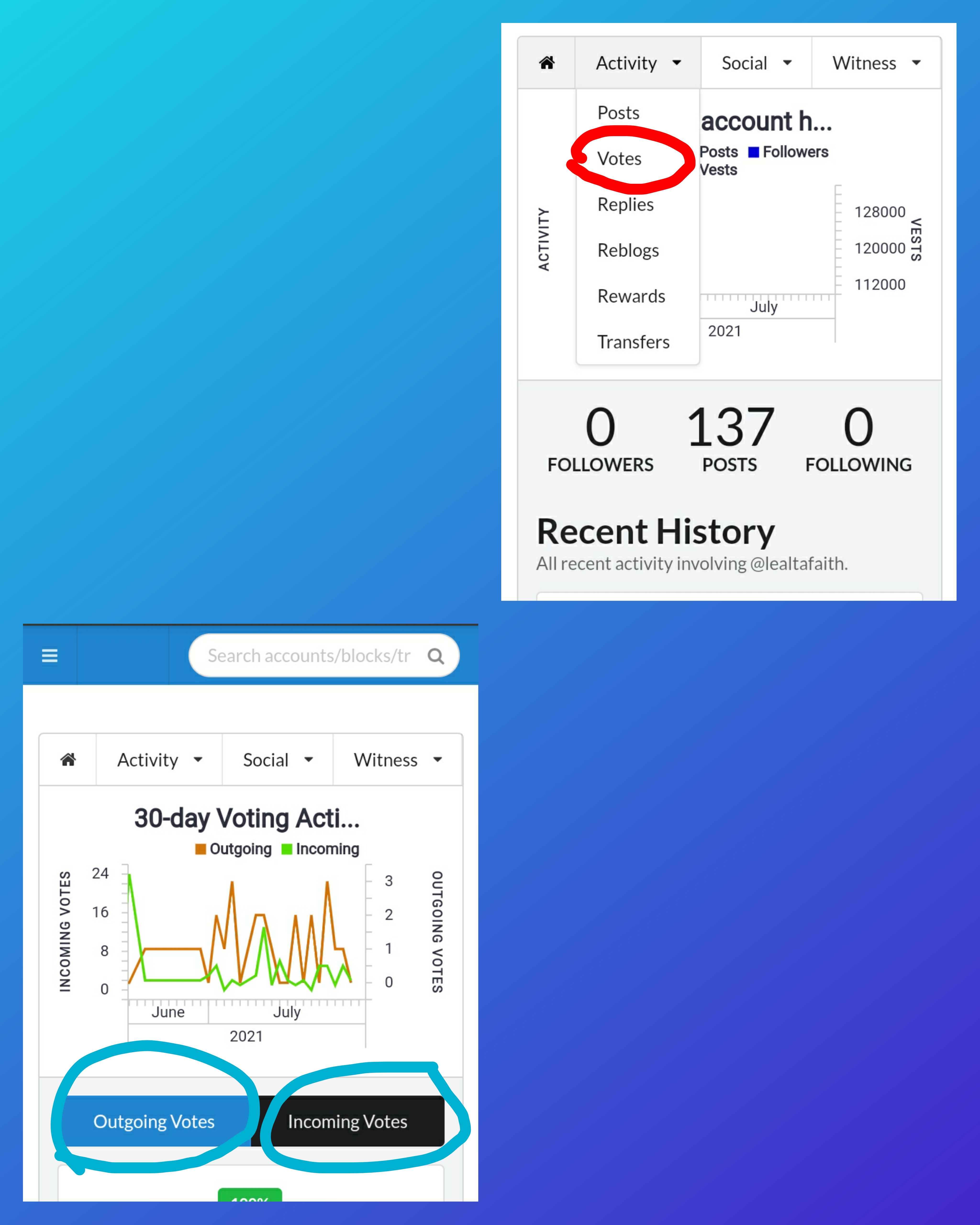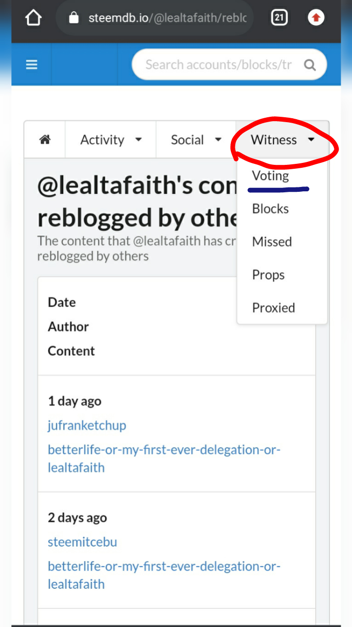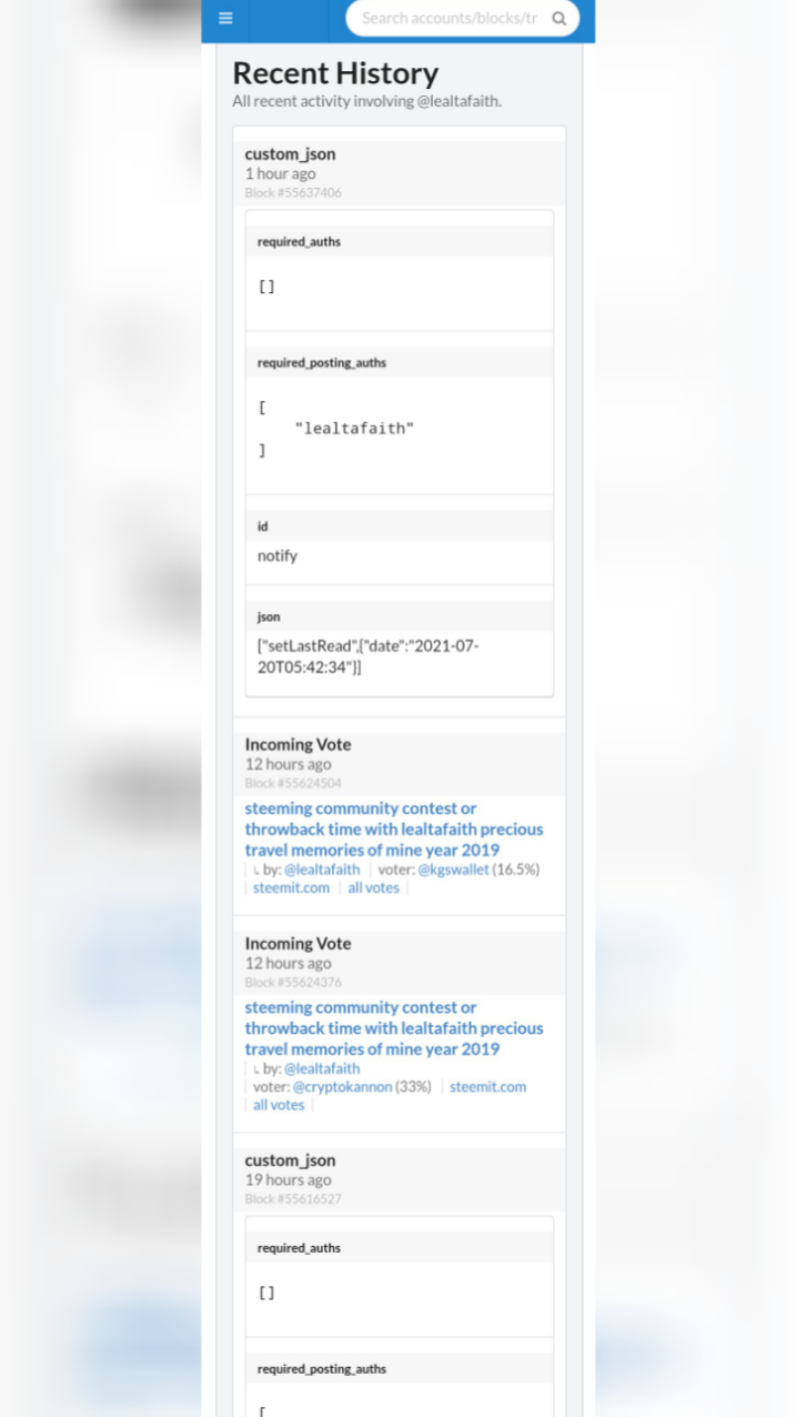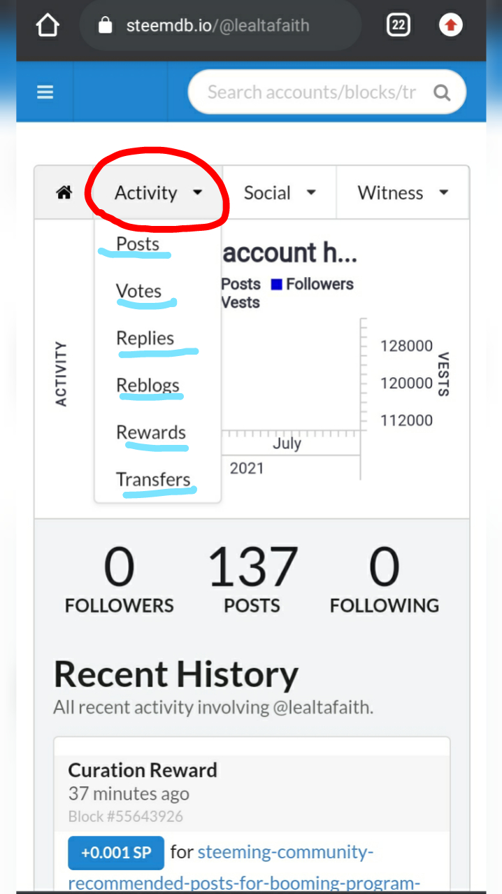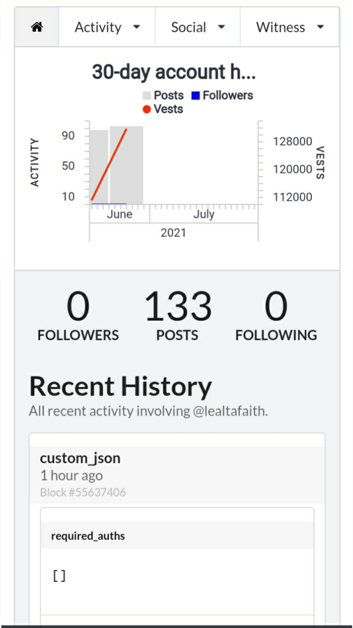 And that is how to see the "recent history". On the left is the above portion of my account's details that shows activity, social and witness options while on the right side shows the data of my "recent history" where we can see all recent activities involving my account since I input @lealtafaith in the search bar.