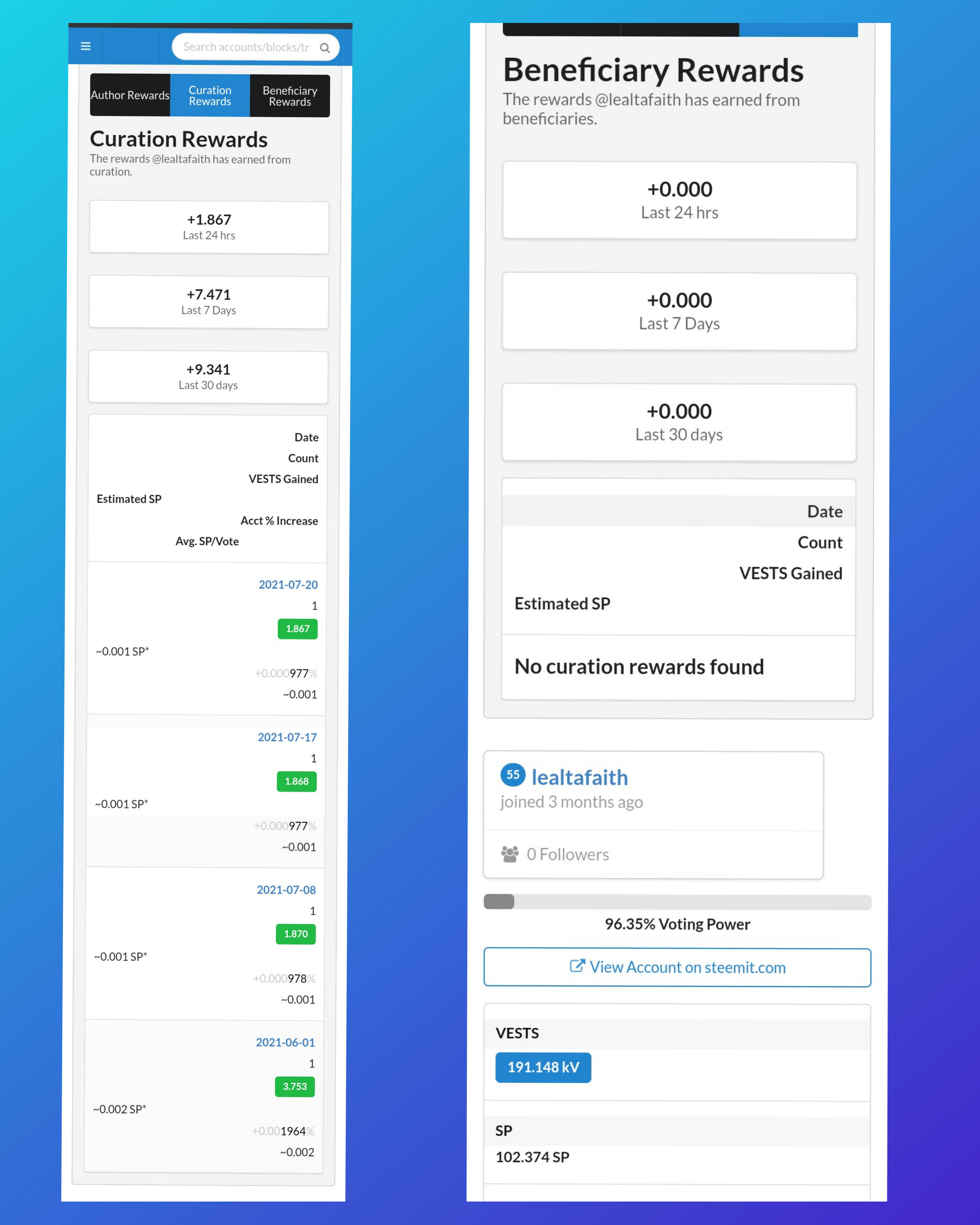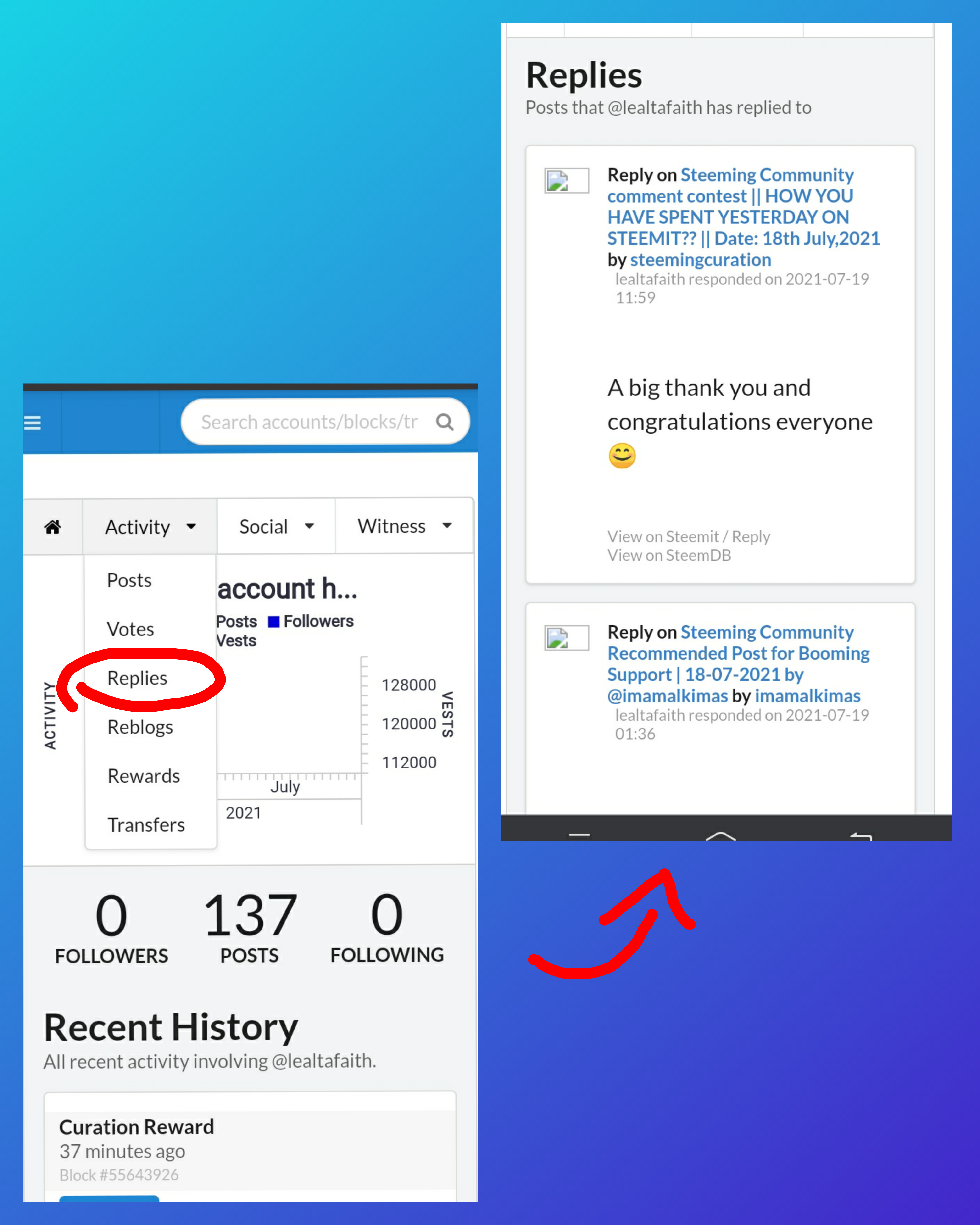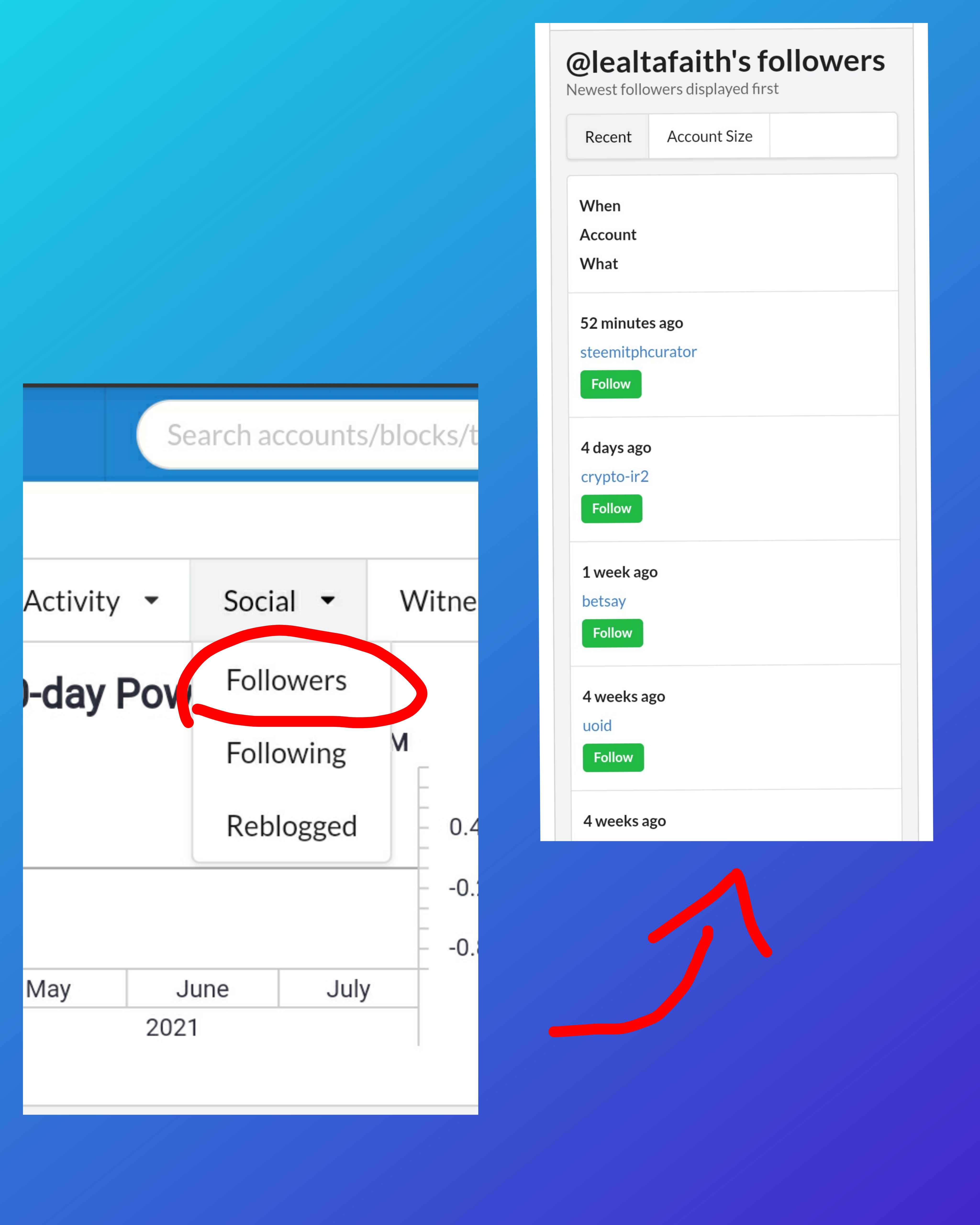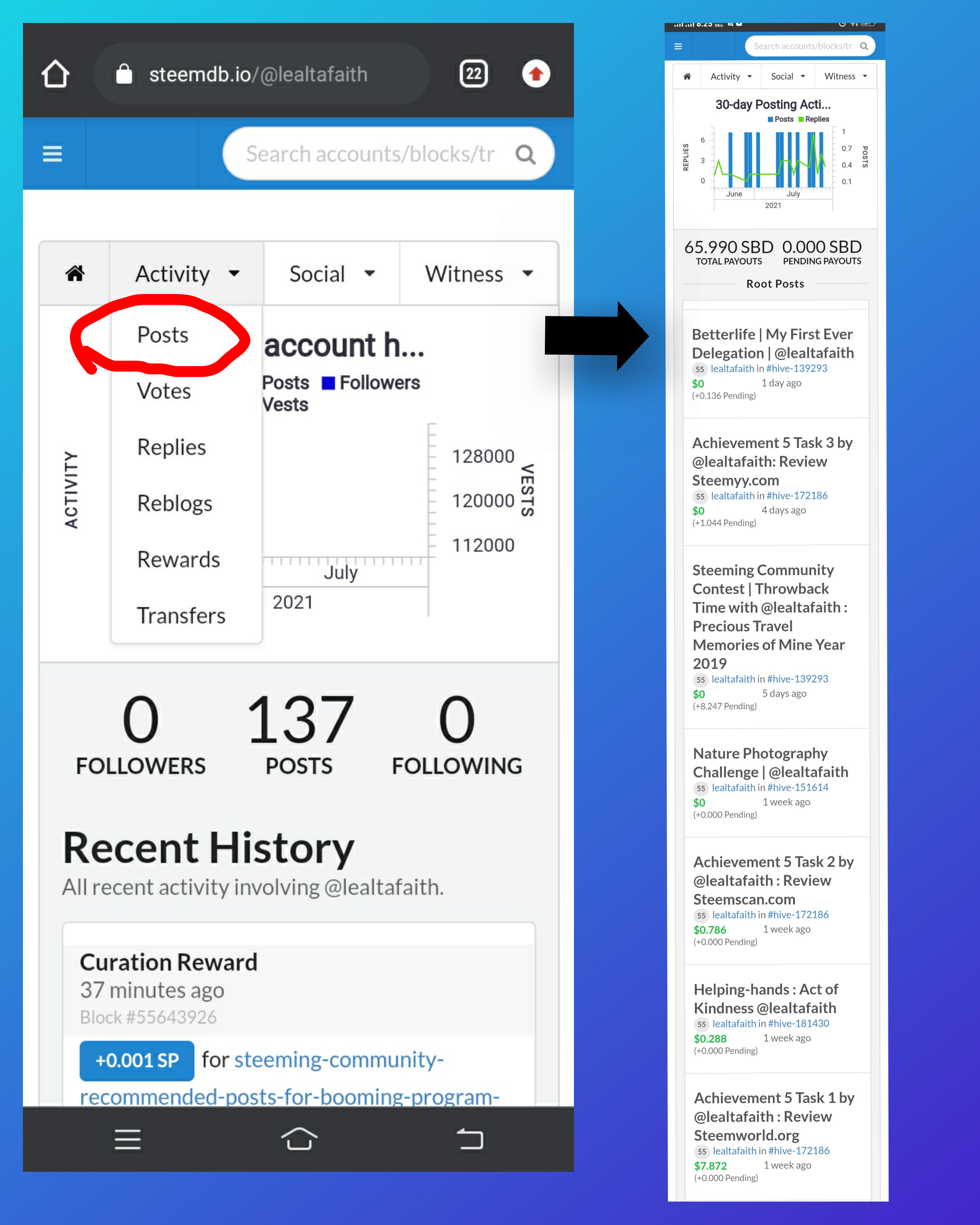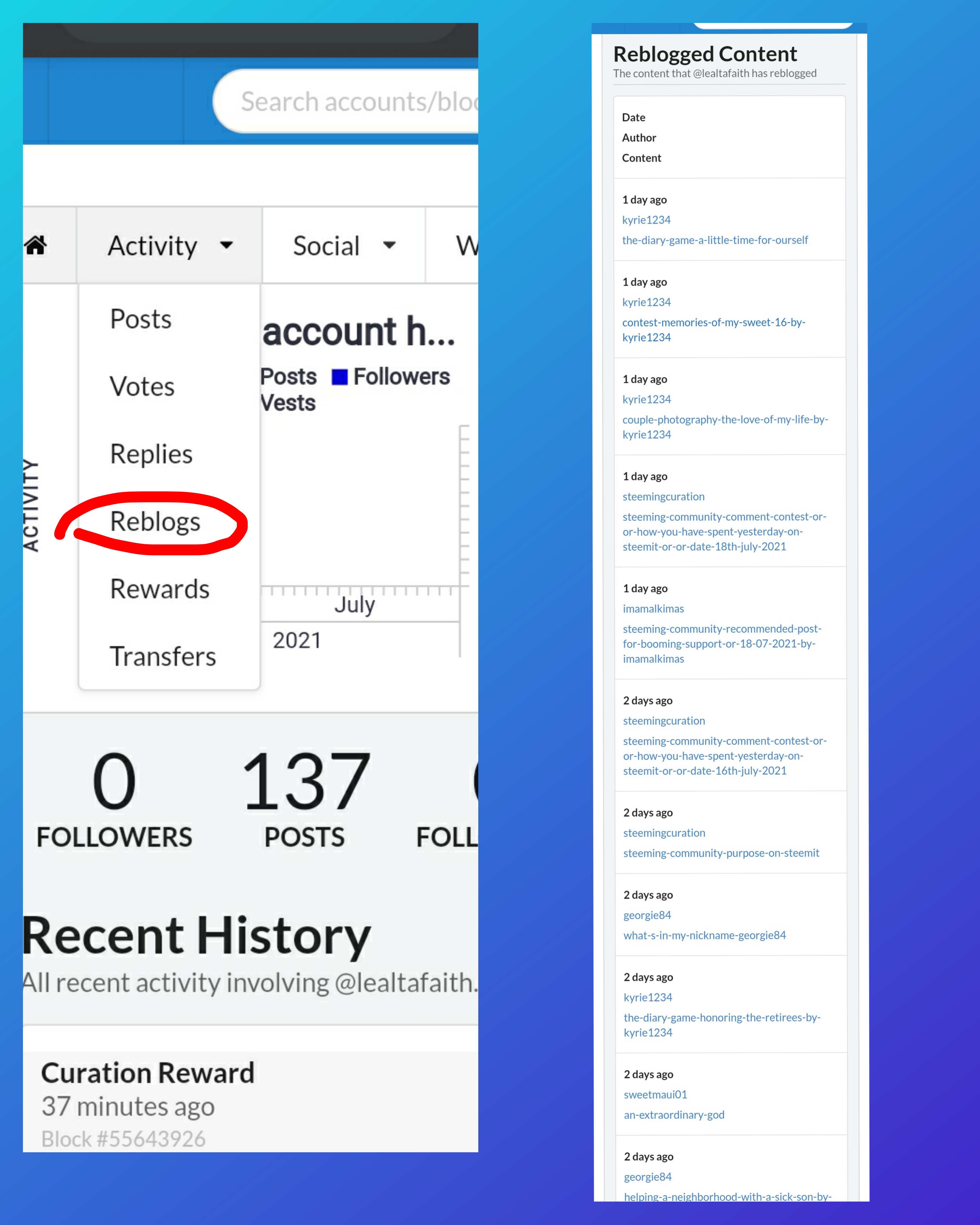 And that is how to see the "recent history". On the left is the above portion of my account's details that shows activity, social and witness options while on the right side shows the data of my "recent history" where we can see all recent activities involving my account since I input @lealtafaith in the search bar.