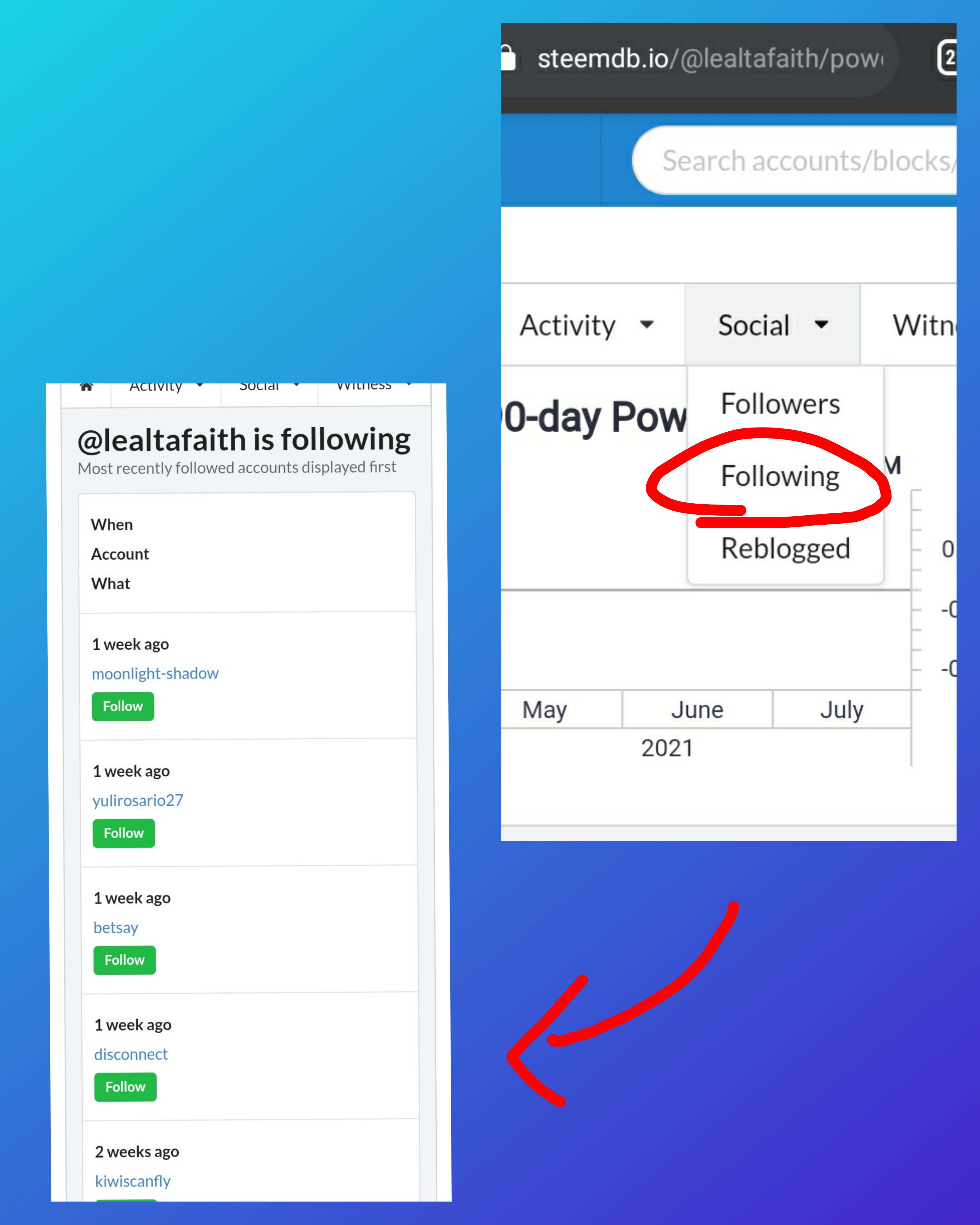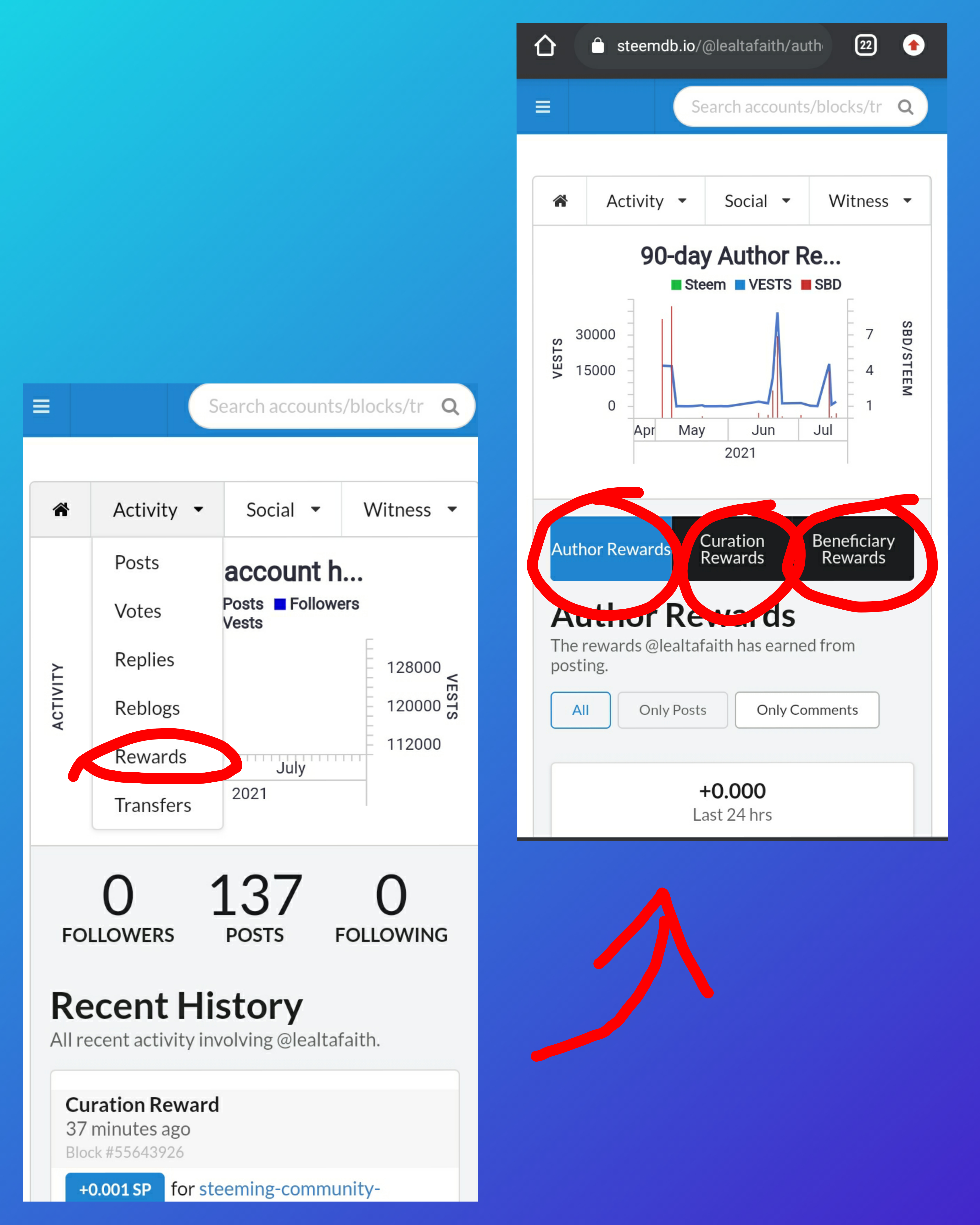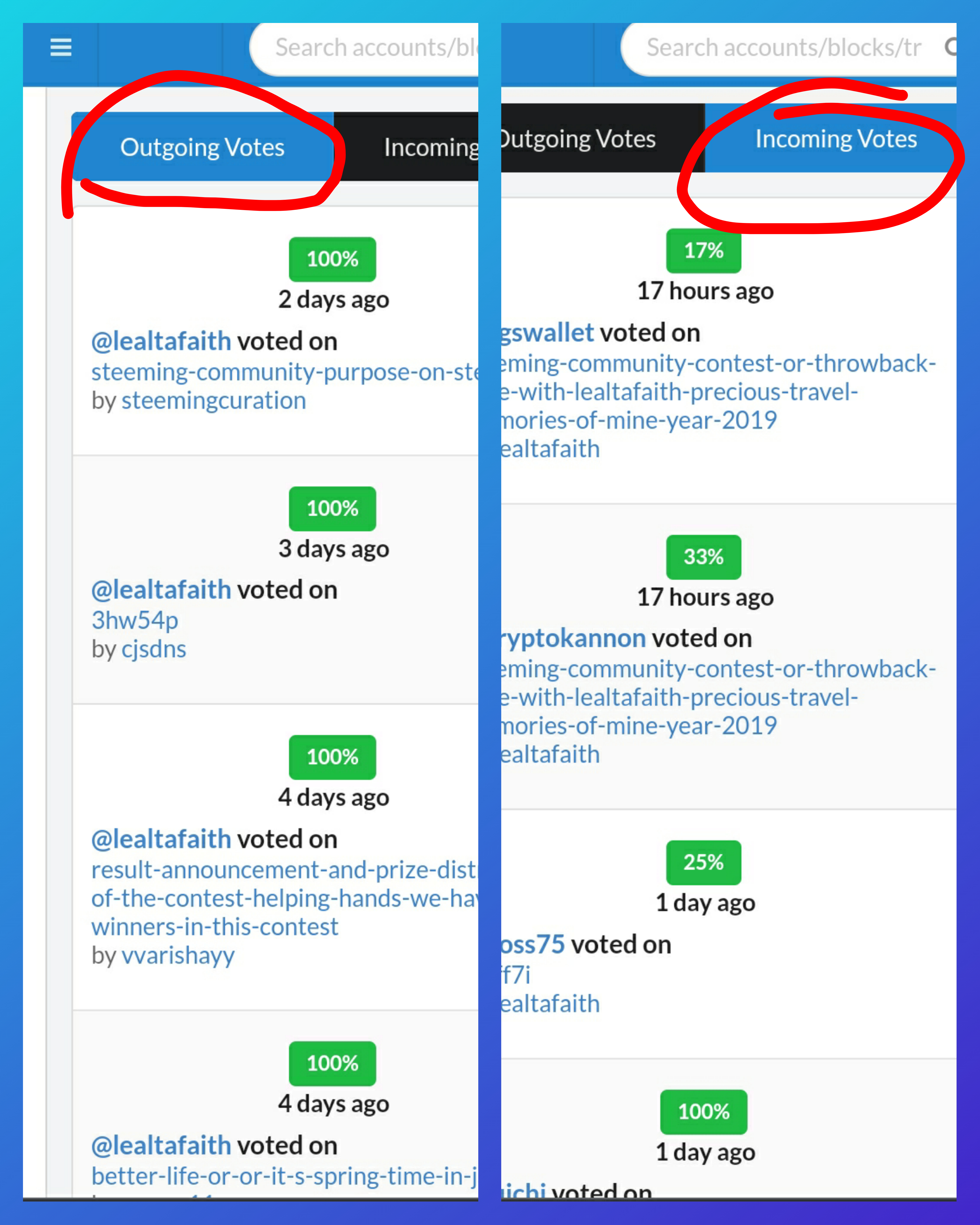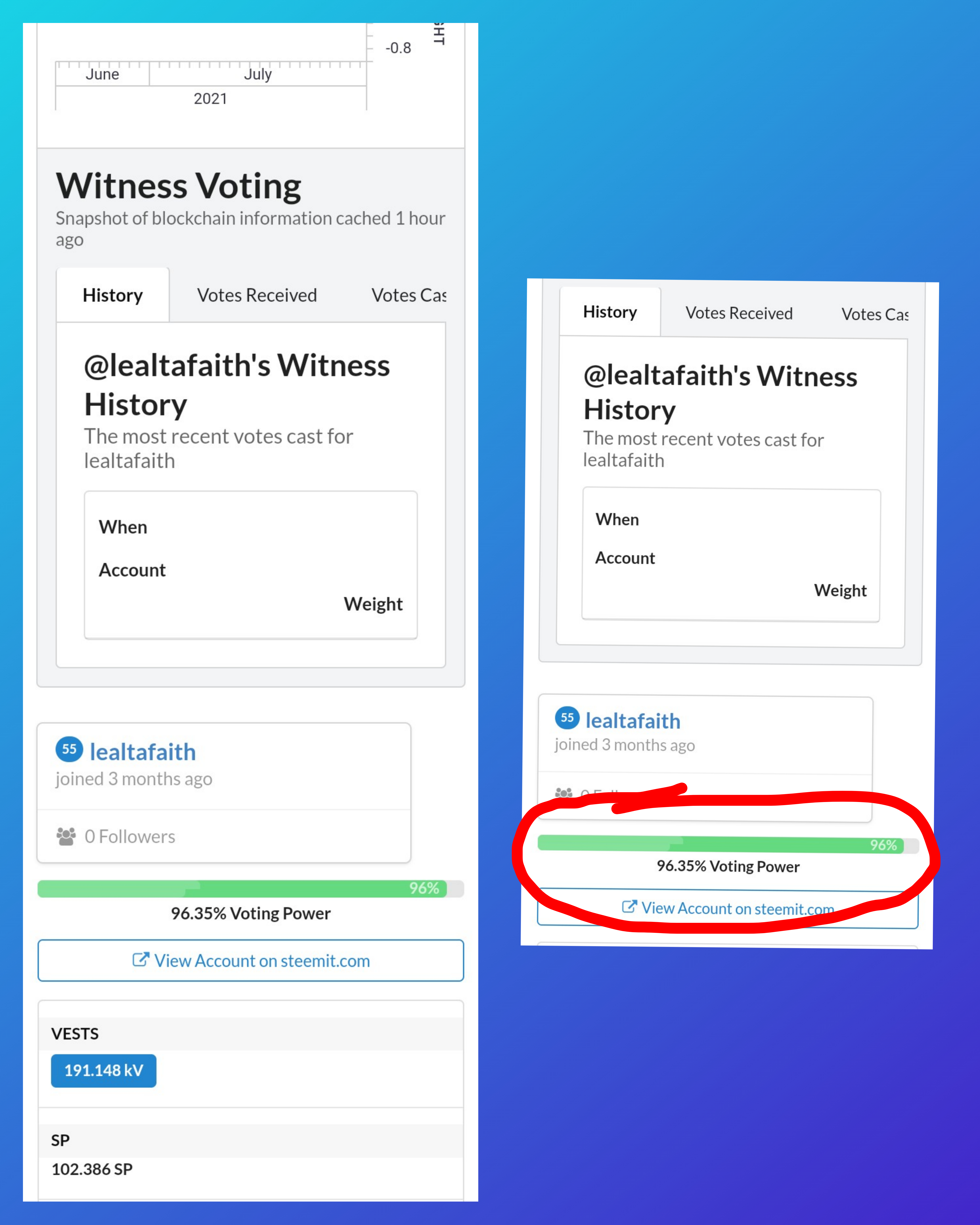 And that is how to see the "recent history". On the left is the above portion of my account's details that shows activity, social and witness options while on the right side shows the data of my "recent history" where we can see all recent activities involving my account since I input @lealtafaith in the search bar.