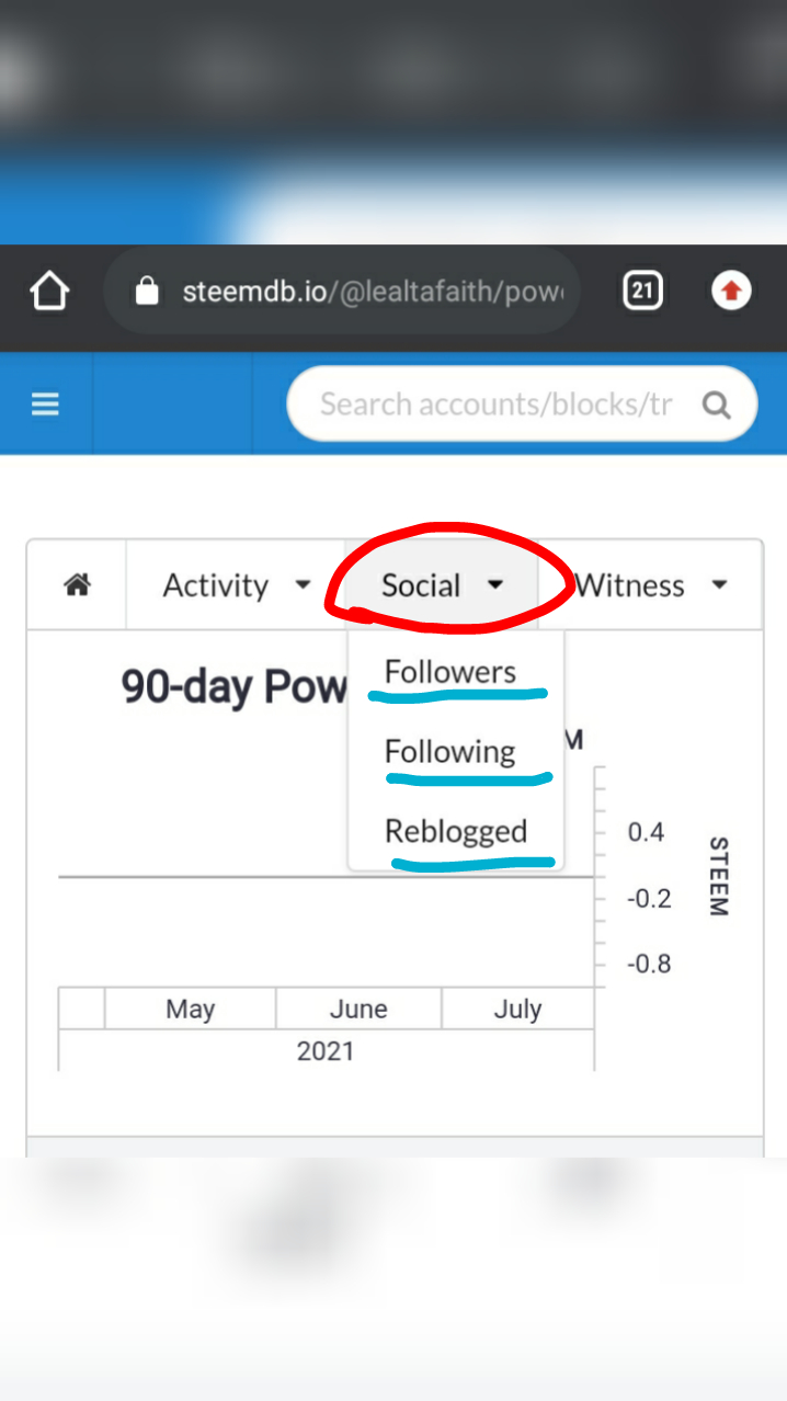 Clicking the dropdown button of "Social" we can find the "Followers", "Following" and "Reblogged" options.