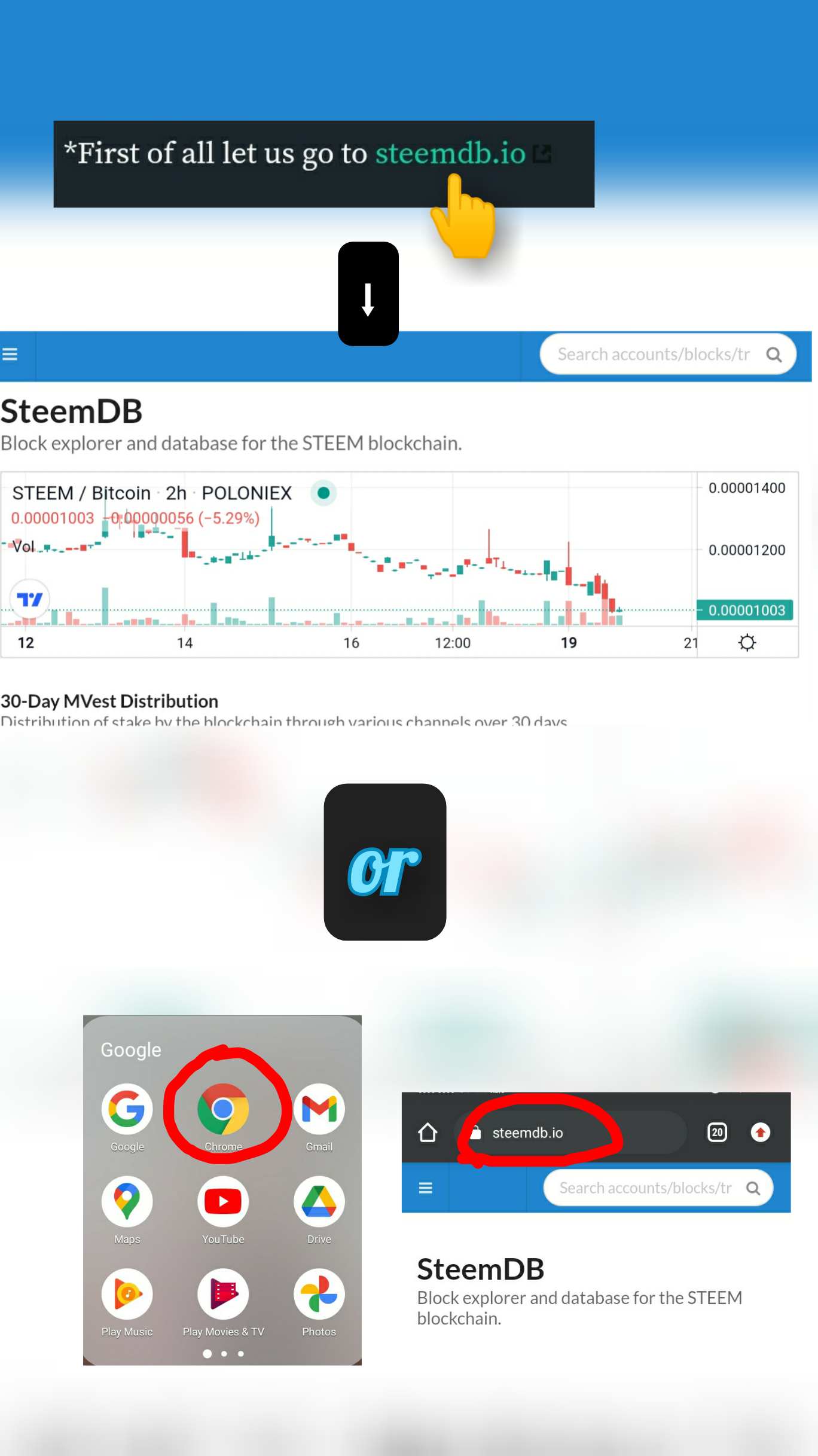 Where we have two options either to click the green highlighted word with the hidden link that leads us to SteemDB Block explorer and database page or go to Google Chrome and search steemdb.io.