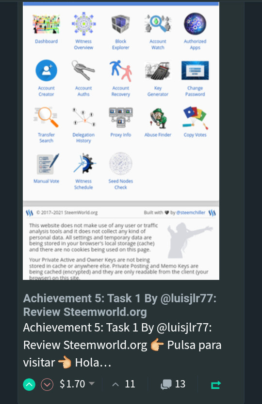 | 5 to Logro: Tarea 1 | ![]() | Revisando https://steemworld.org, aplicación creada por @steemchiller |