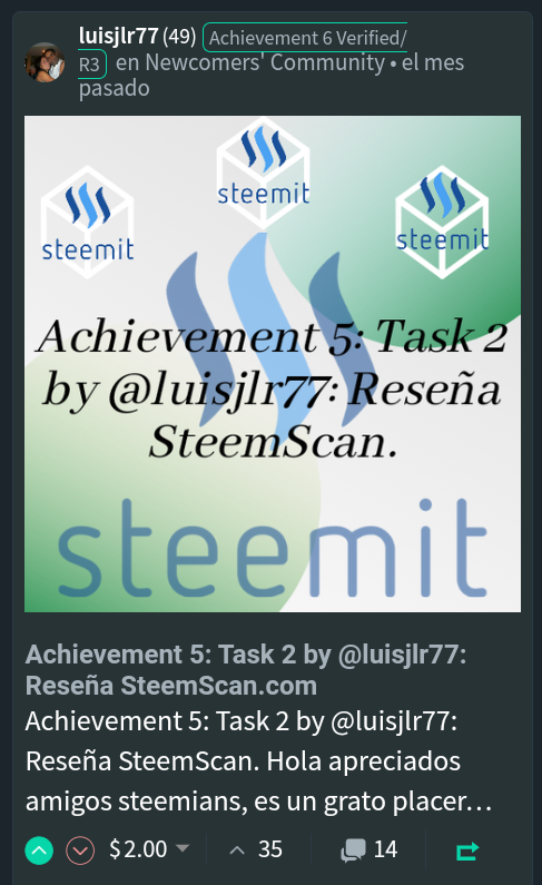 | 5 to Logro: Tarea 2 | ![]() | Para este logro se reviso la aplicación https://steemscan.com/ creada por @futureshock |