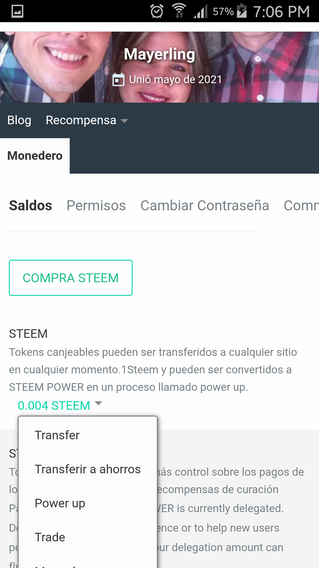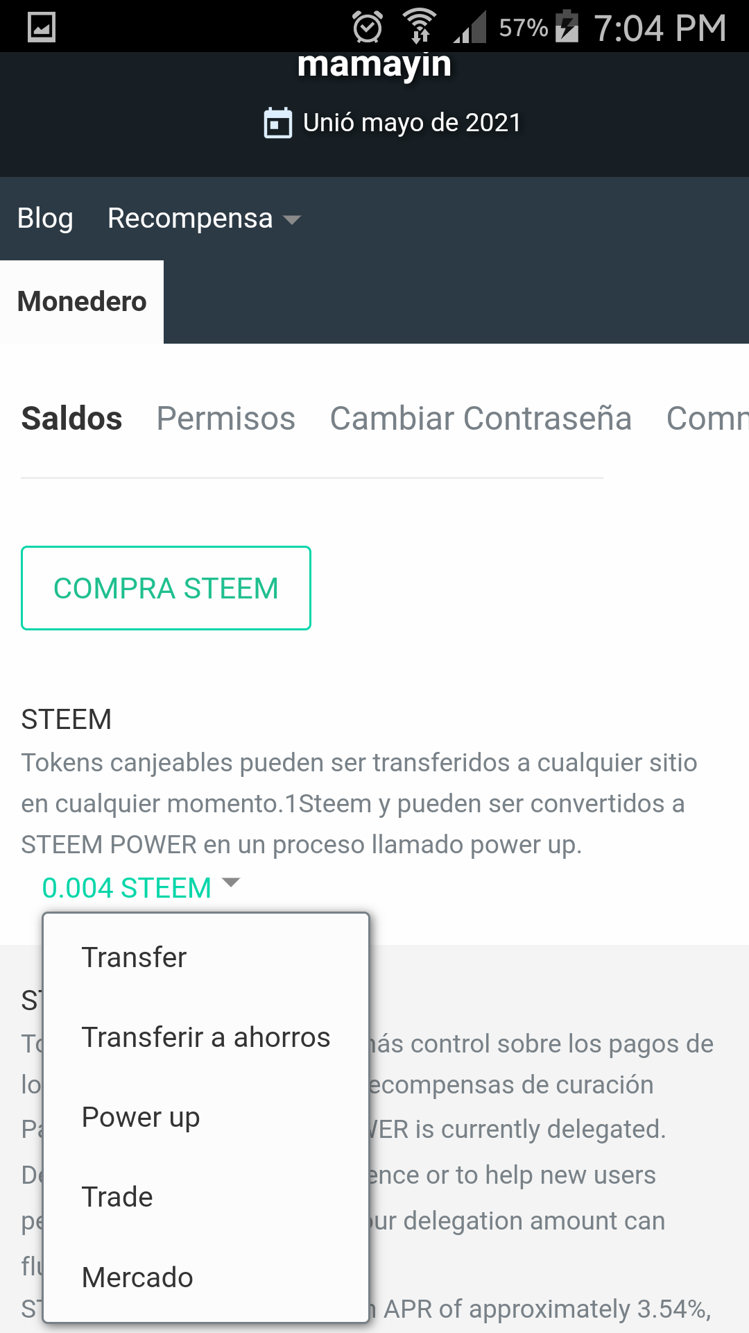 Al ingresar a monedero se selecciona steem y se le da a transferir.