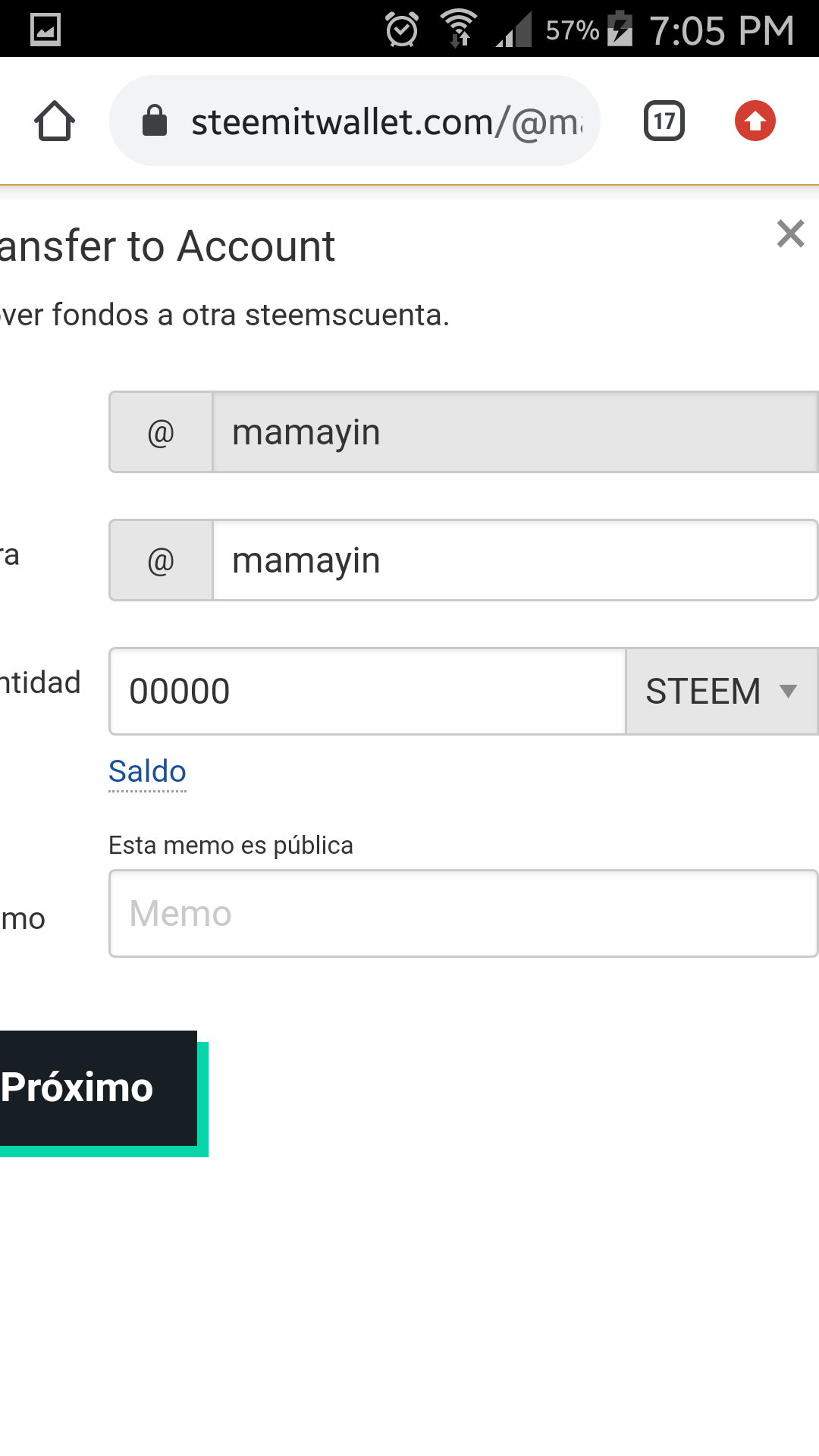 Se ingresa usuario al que se le va a transferir ,el monto y el memo es opcional.