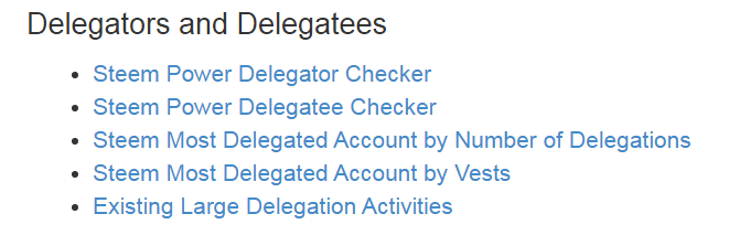 Alat ini memeriksa kepada siapa Anda mendelegasikan Steem Power Anda (Delegasi Anda). API gratis untuk digunakan untuk mendapatkan delegasi juga tersedia saat ini di empat server API di seluruh dunia. Alat ini kebalikan dari Memeriksa Delegator (Yang mendelegasikan Steem Power kepada Anda).