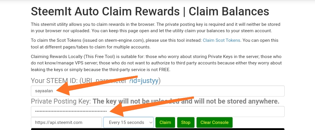Untuk langlah selanjutnya atau cara mengisi form klaim reward ini kita hanya perlu mengisi username dan Posting Key kita kemudian klik Claim pada fitur ini kita bisa mengatur waktu pengeklaiman, adapun waktunya bisa setiap 5 detik sampai 2 jam. Untuk berhenti kita hanya perlu klik Stop.