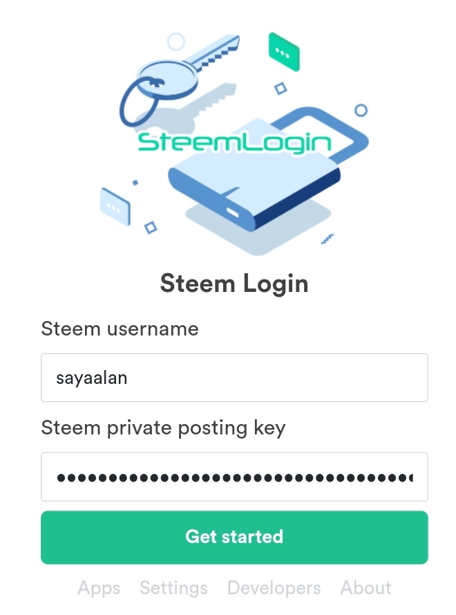 Klik Continue untuk melanjutkan, dan kita akan di alihkan ke steem login, isi user name dan active key, lalu tekan get started seperti pada tampilan dibawah ini :