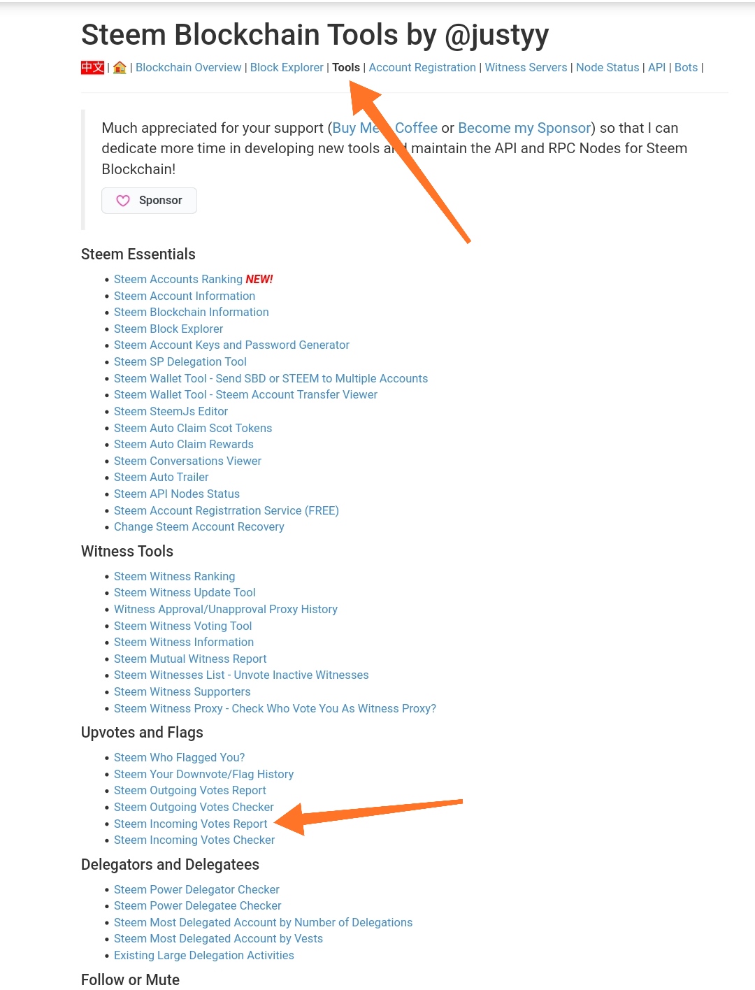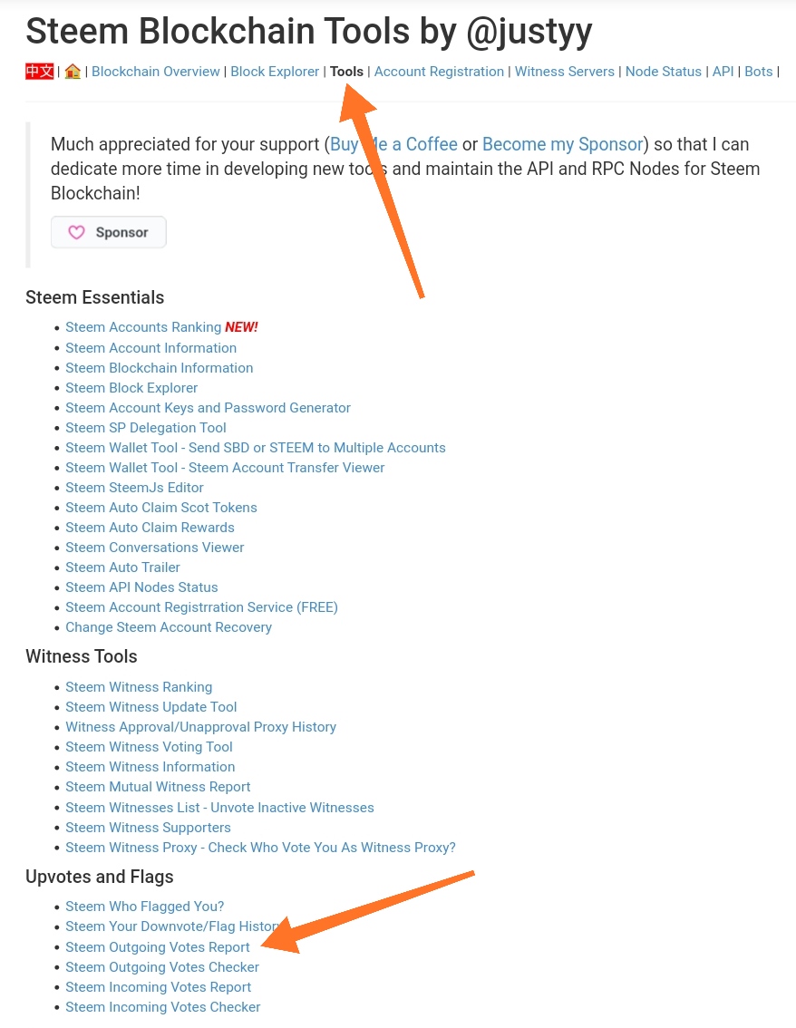 Klik Tools kemudian klik dan pilih Steem Outgoing Votes Report pada bagian Upvotes and Flags.