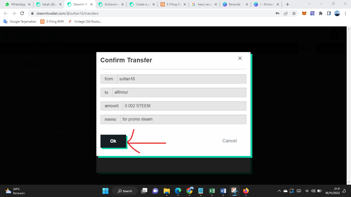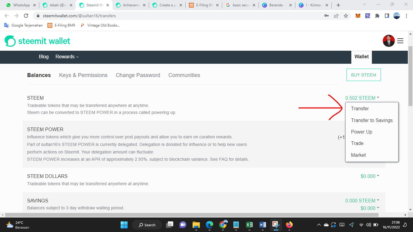 Kemudian klik menu transfer di steem