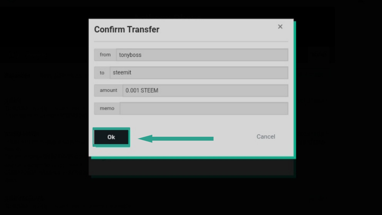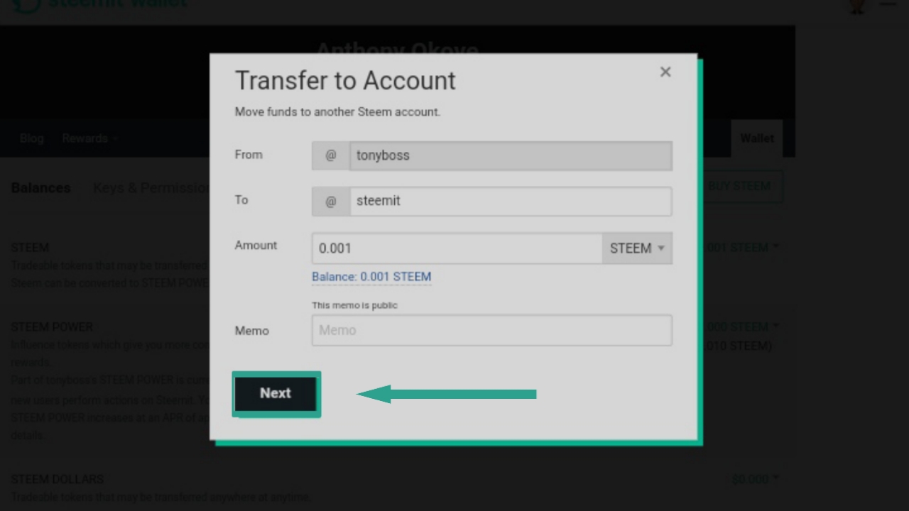 I entered the username and number of steem I was going to send and click on "Next"