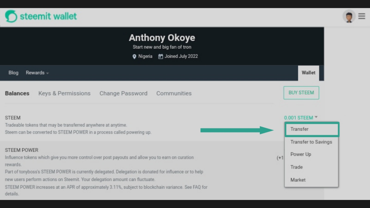 Then I clicked on the drop arrow next to the steem token, then I clicked on "Transfer".