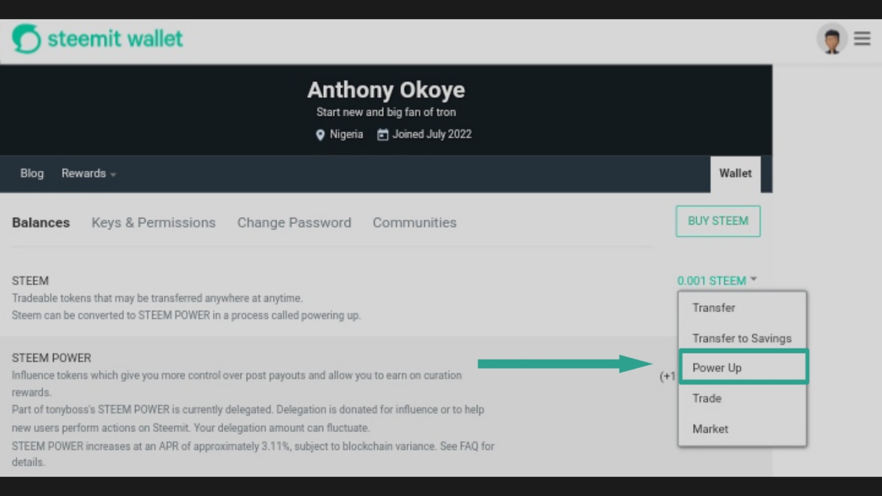 I clicked on the drop arrow next to the steem token, then I clicked on "Power up".
