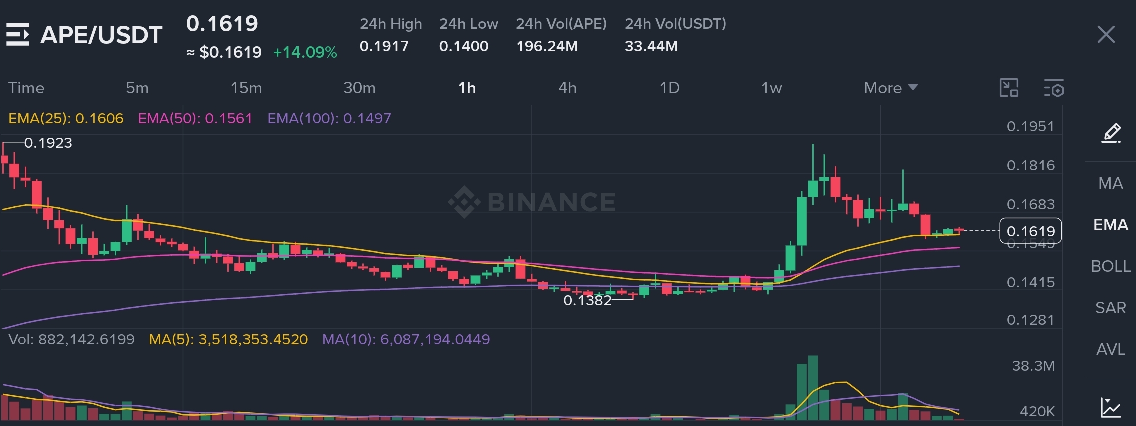 APE/USDT on Binance just surged +14.09% in 24 hours to $0.1619, hitting a high of $0.1917 with strong volume 196.24M APE traded + $33.44M USDT!