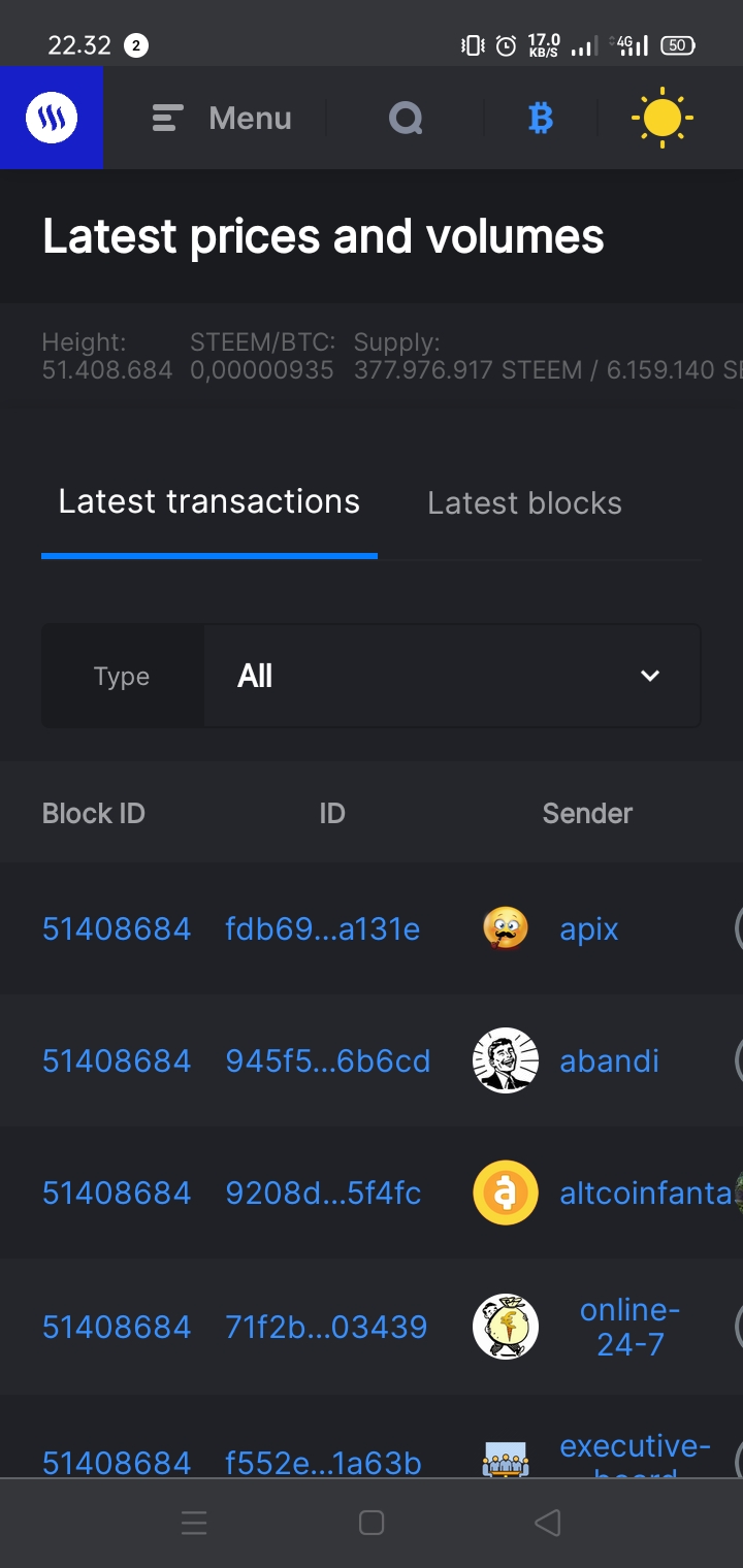 Dengan steemscan, pengguna steem dapat melihat berbagai transaksi terbaru yang terjadi di steem blockchain termasuk Voting, komentar, dll. Fitur ini memiliki karakter yang ditabulasikan dalam berbagai judul seperti: Block ID, ID, Sender, Receiver / Permlink / Id, Jenis, Jumlah /% / Muatan.